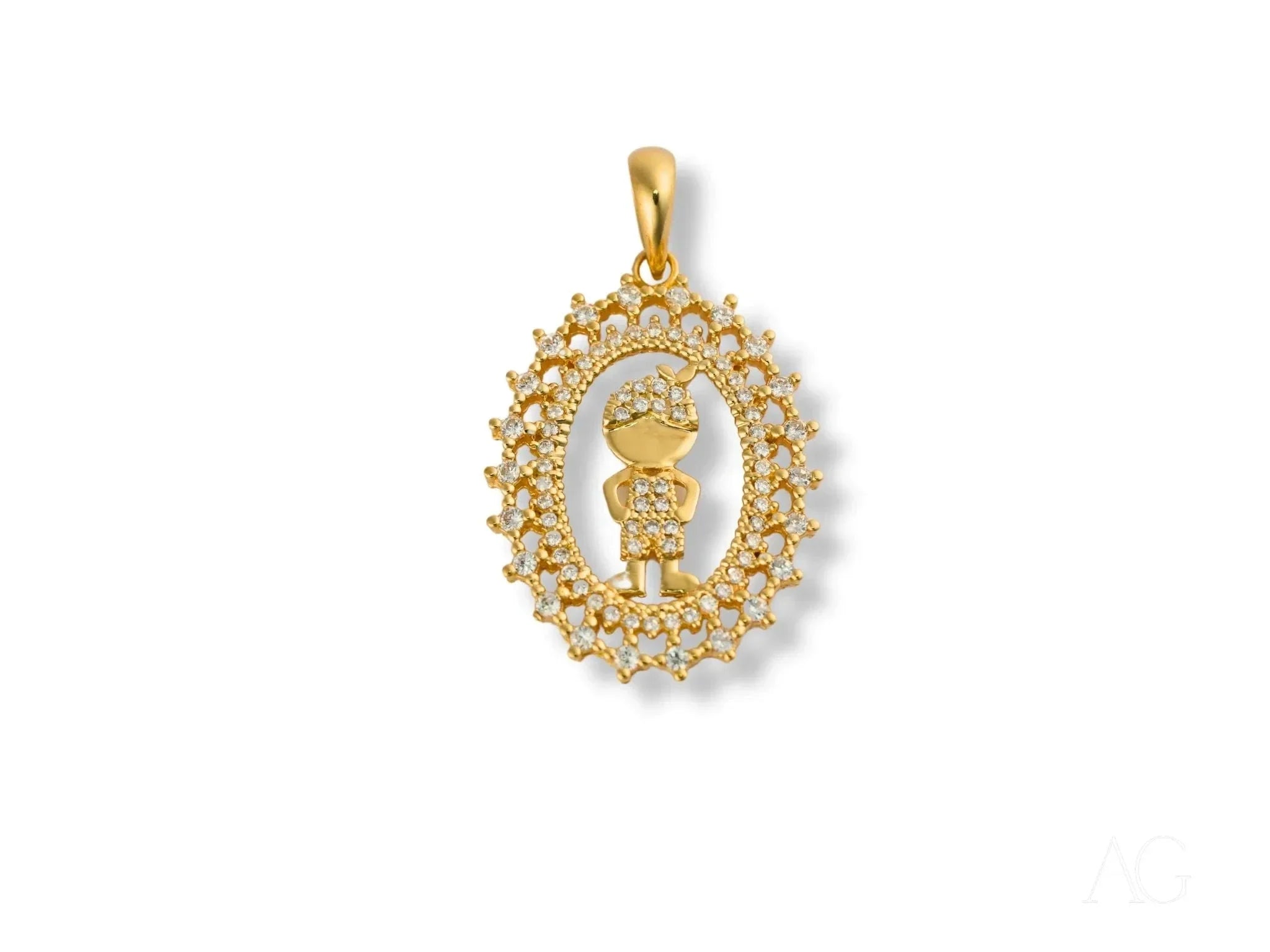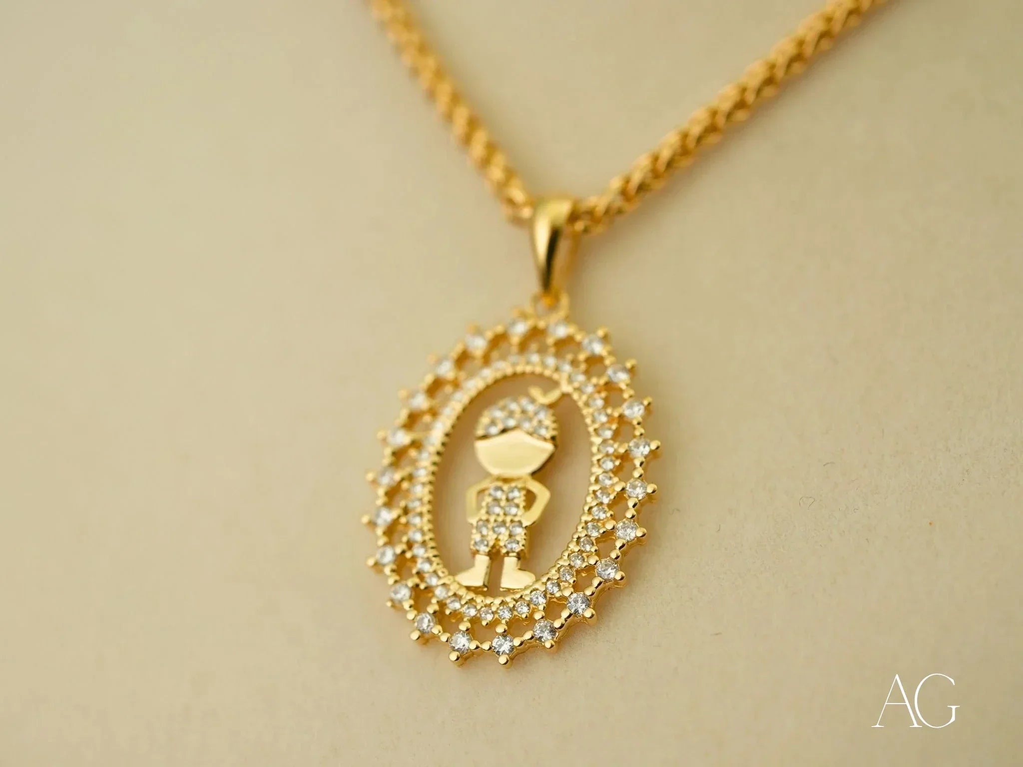 The golden charm boy pendant possesses a substantial feel that signifies quality and craftsmanship. It's perfectly weighted to be noticeable yet comfortable for everyday wear or special occasions, making it a cherished part of any jewelry collection.