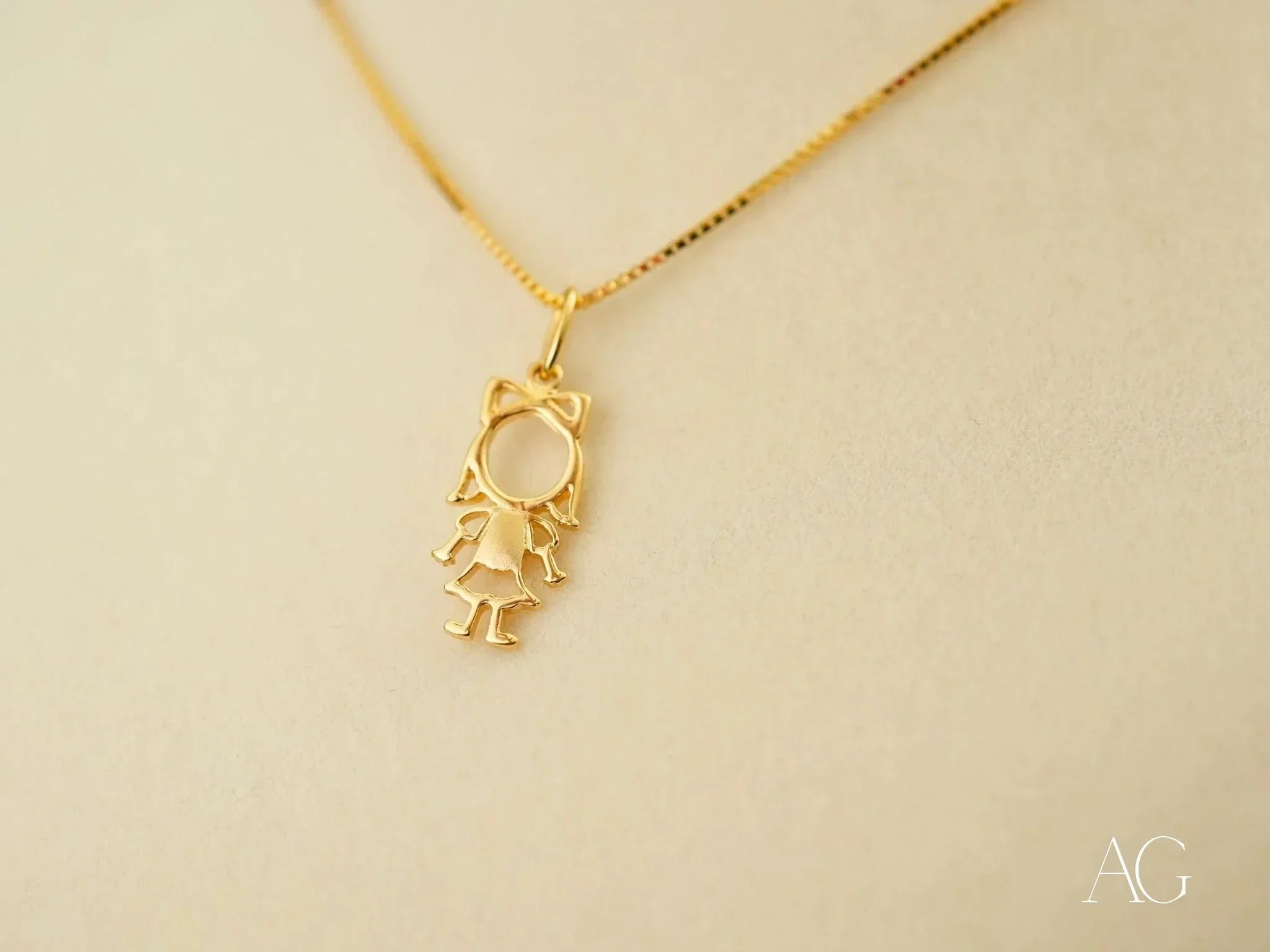 The doll girl design evokes the grace and joy of childhood, celebrating the precious bond between loved ones. It's a poignant reminder of innocence, playfulness, and the enduring power of connection, making this golden grace a meaningful addition to any jewelry collection.