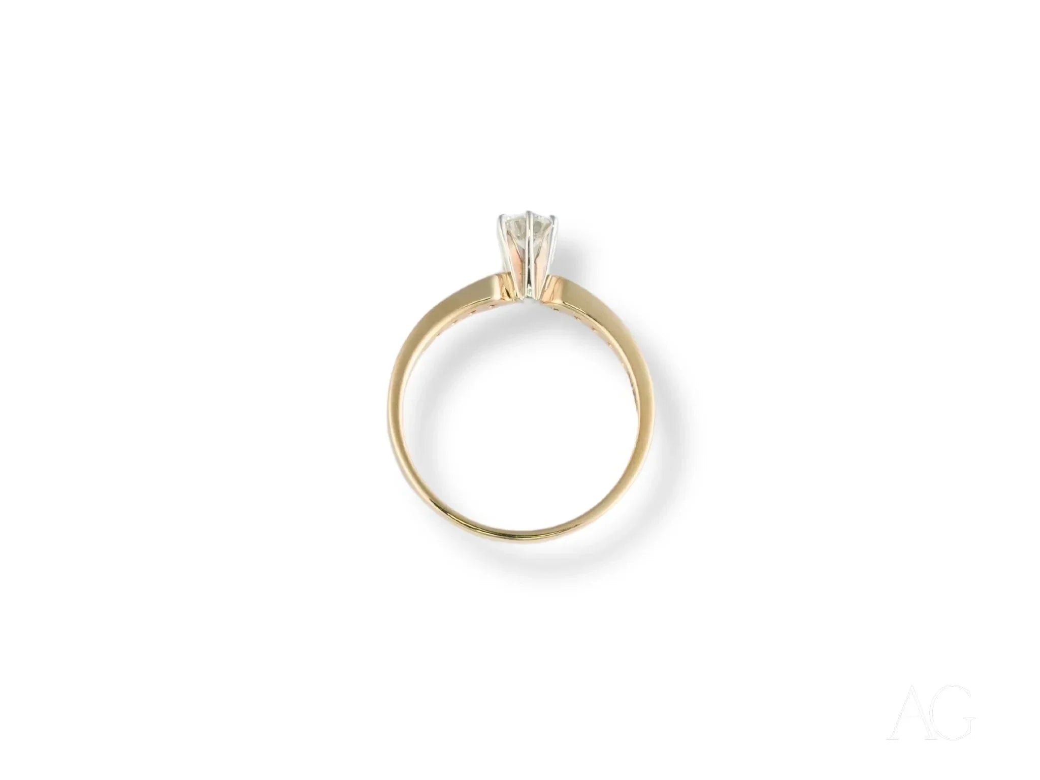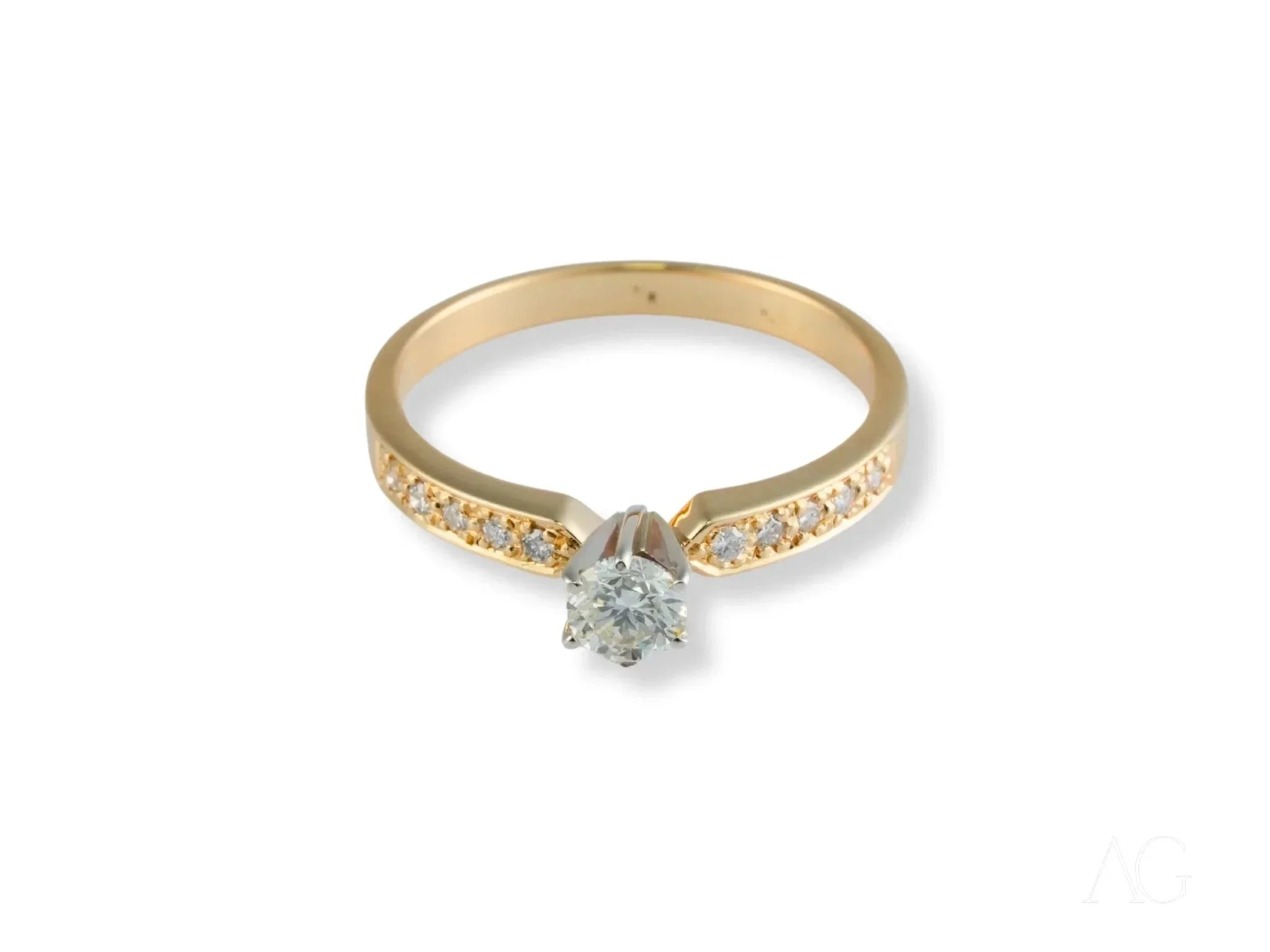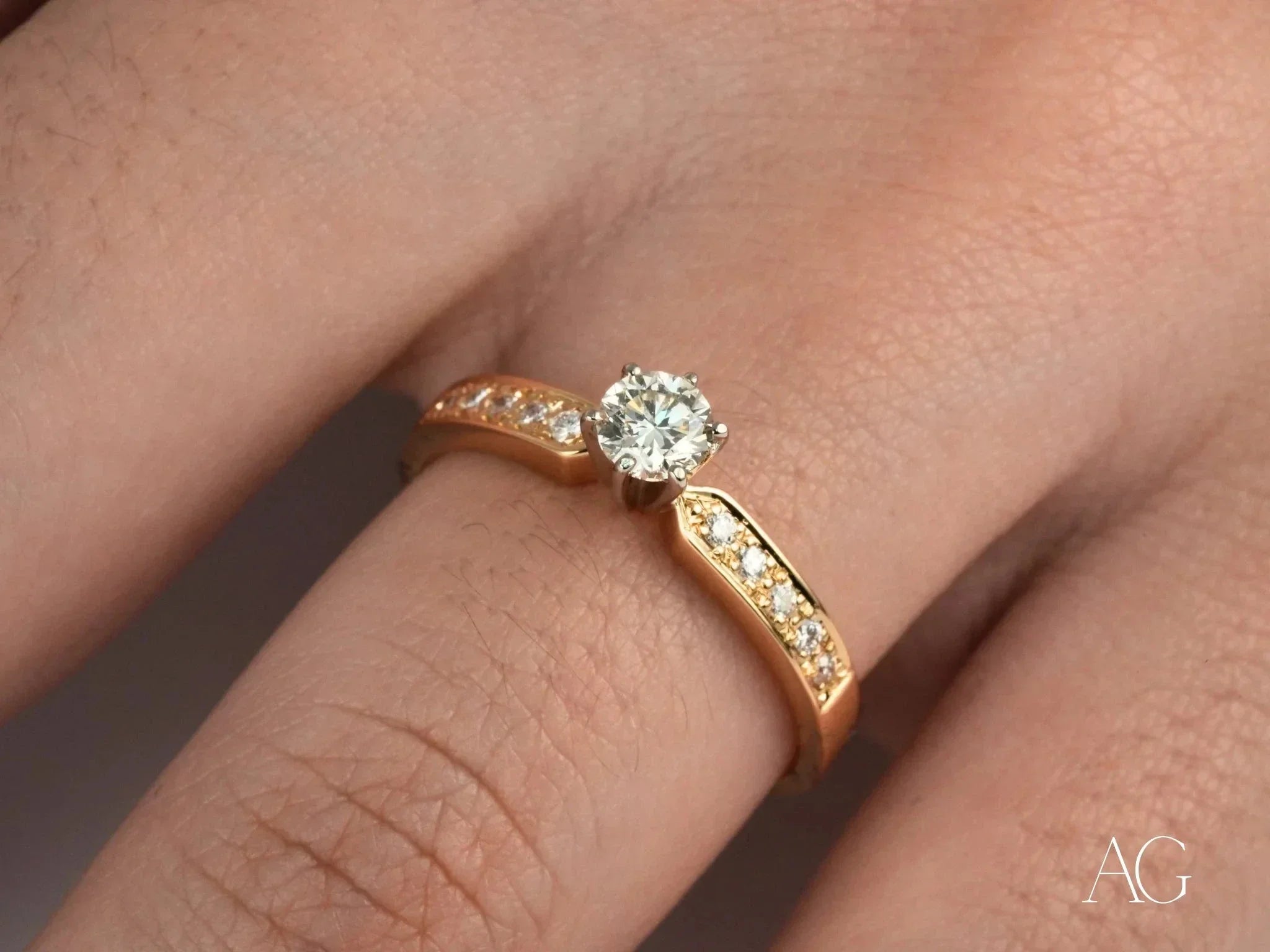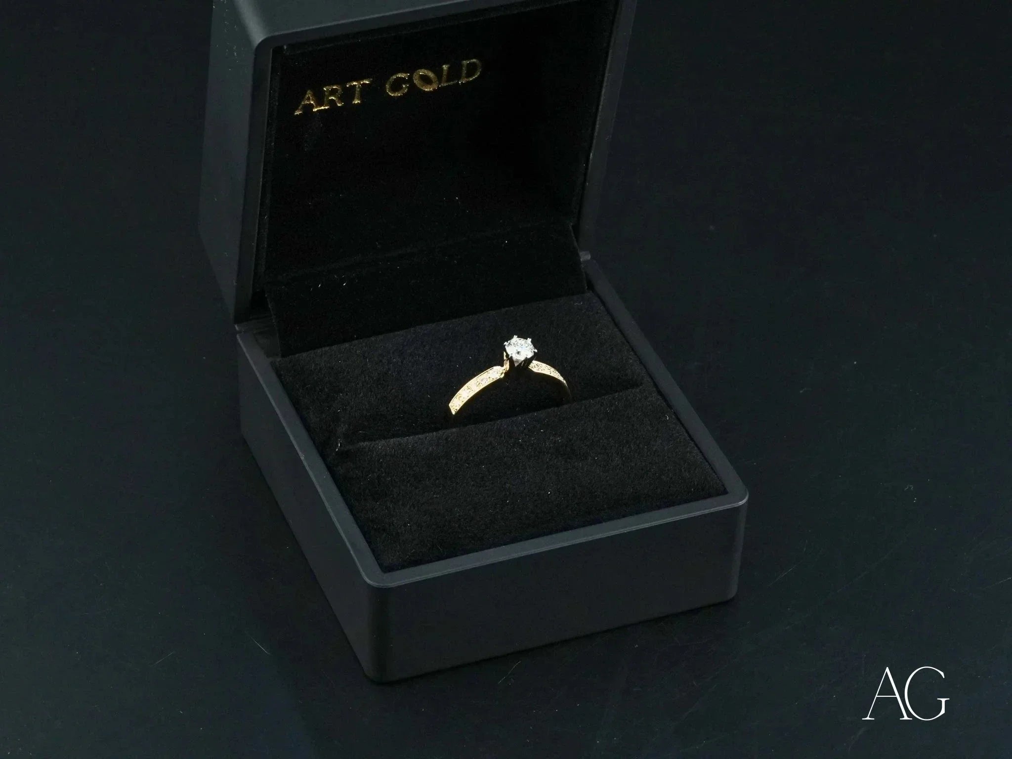The Golden Promise: 18k Gold Engagement Ring with 0.31 Ct Center Diamond and Accented Band is more than just jewelry; it's an embodiment of everlasting love, a promise whispered in gold and diamonds. Its radiant 18k gold setting, breathtaking center diamond, and exquisitely accented band make it the ultimate symbol of a timeless commitment. Choose the Golden Promise engagement ring and present a gift that speaks volumes of your love, a treasure to be cherished for eternity, presented in an elegant Art Gold Jewelry ring box.