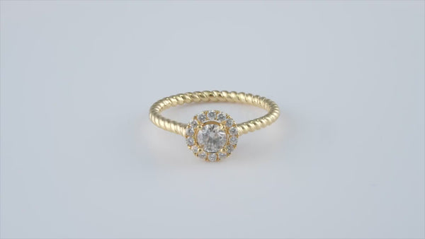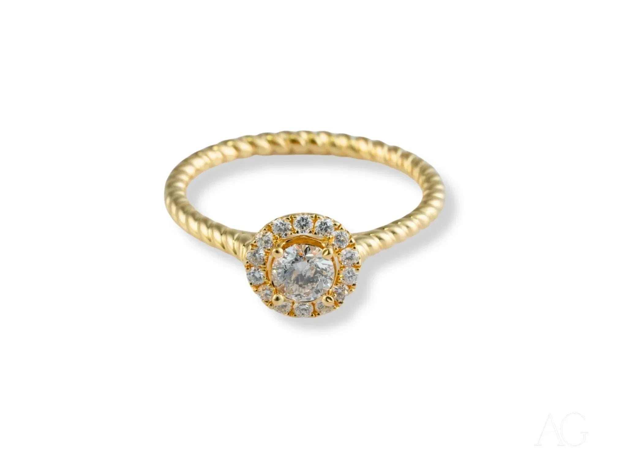 0.35 Ct Center Diamond: The brilliant center diamond, a beacon of your everlasting love, captures and reflects light with mesmerizing sparkle. Its carefully chosen size strikes the perfect balance between brilliance and delicate grace.Diamond Halo (0.16 Ct): The halo of smaller diamonds doesn't just amplify the center stone's radiance; it creates an aura of ethereal beauty, adding depth and dimension to this exquisite piece. This halo elevates the ring's elegance, making it a true symbol of timeless love.Twisted Band Design: The uniquely twisted band of this 18k gold engagement ring is more than just a design element; it's a symbol of two lives intertwining, creating a shared path filled with love and adventure. This modern twist adds a touch of individuality to a classic design, reflecting the unique nature of your love.18k Gold Setting: Crafted in luxurious and durable 18k gold, this ring is designed to withstand the test of time, just like your love. The rich golden hue adds warmth and sophistication, making it a piece you'll cherish forever. The 18k gold setting is hypoallergenic and resistant to tarnish, ensuring lasting beauty.Approx. 2.69 Grams: Designed for effortless everyday wear, this art gold ring offers a luxurious feel without compromising comfort. Its lightweight design allows you to wear it with ease, making it a constant reminder of your special bond.