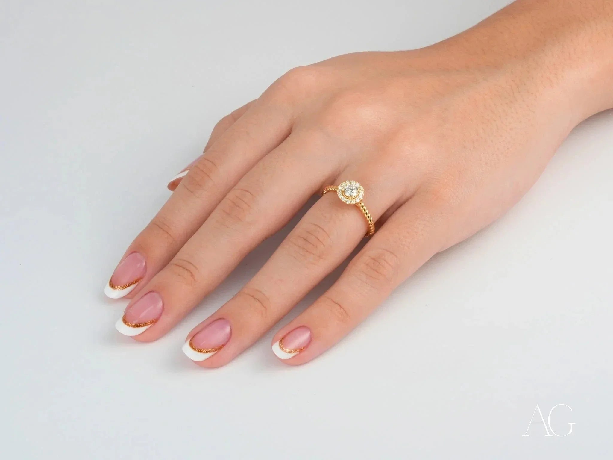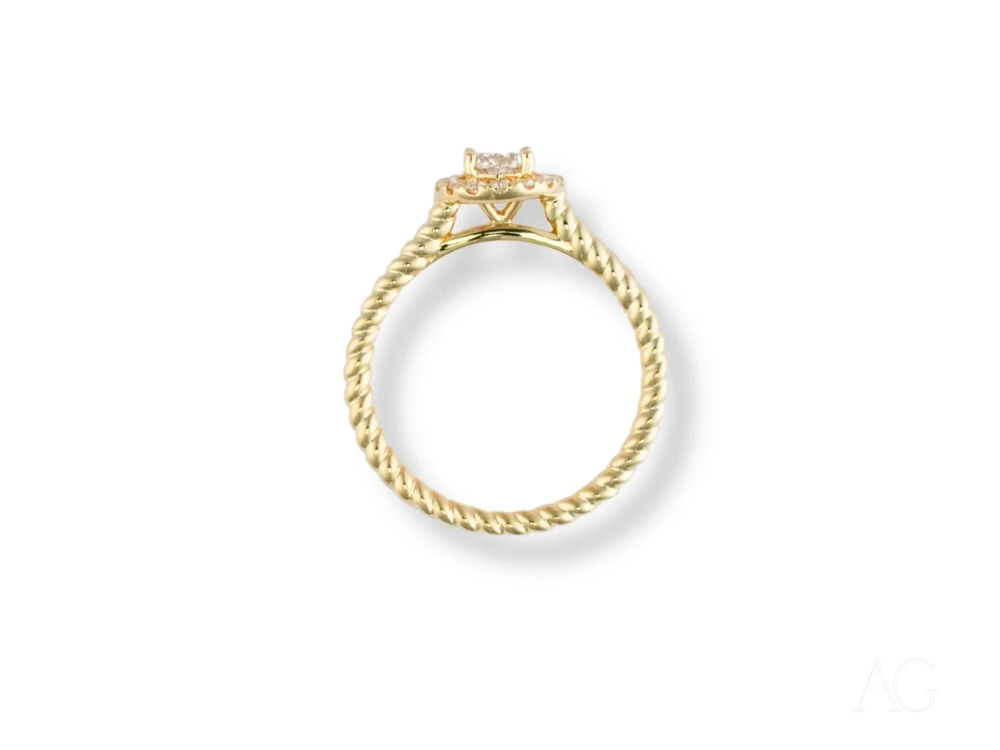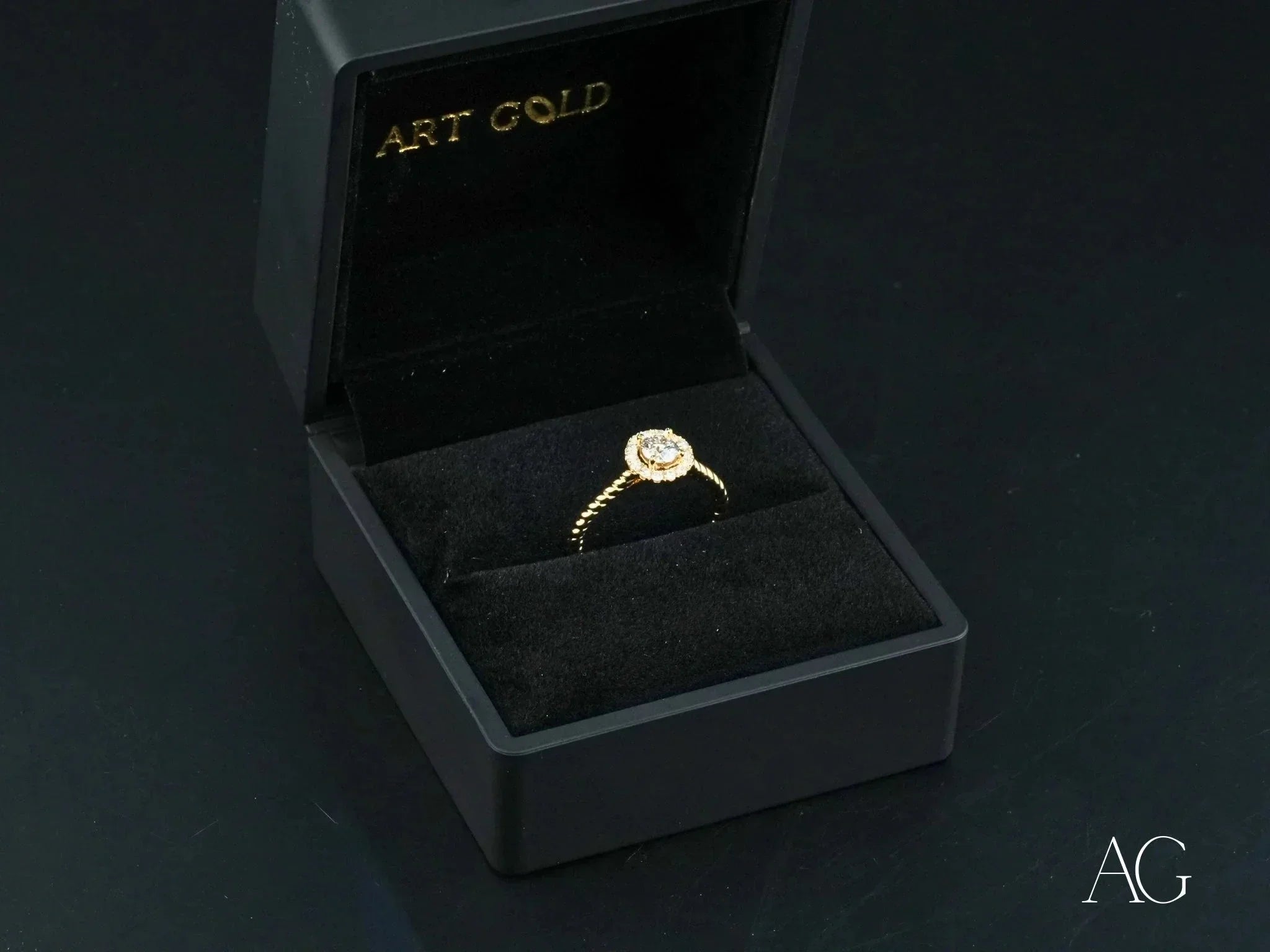 The Twist of Grace: 18k Gold Engagement Ring with 0.35 Ct Center Diamond and Halo is the ultimate expression of a unique and intertwined love story. This twisted band engagement ring, with its radiant halo and luxurious 18k gold setting, exudes both timeless elegance and modern charm. Choose the Twist of Grace, an art gold masterpiece, and begin your forever story with a symbol as captivating as your love.
