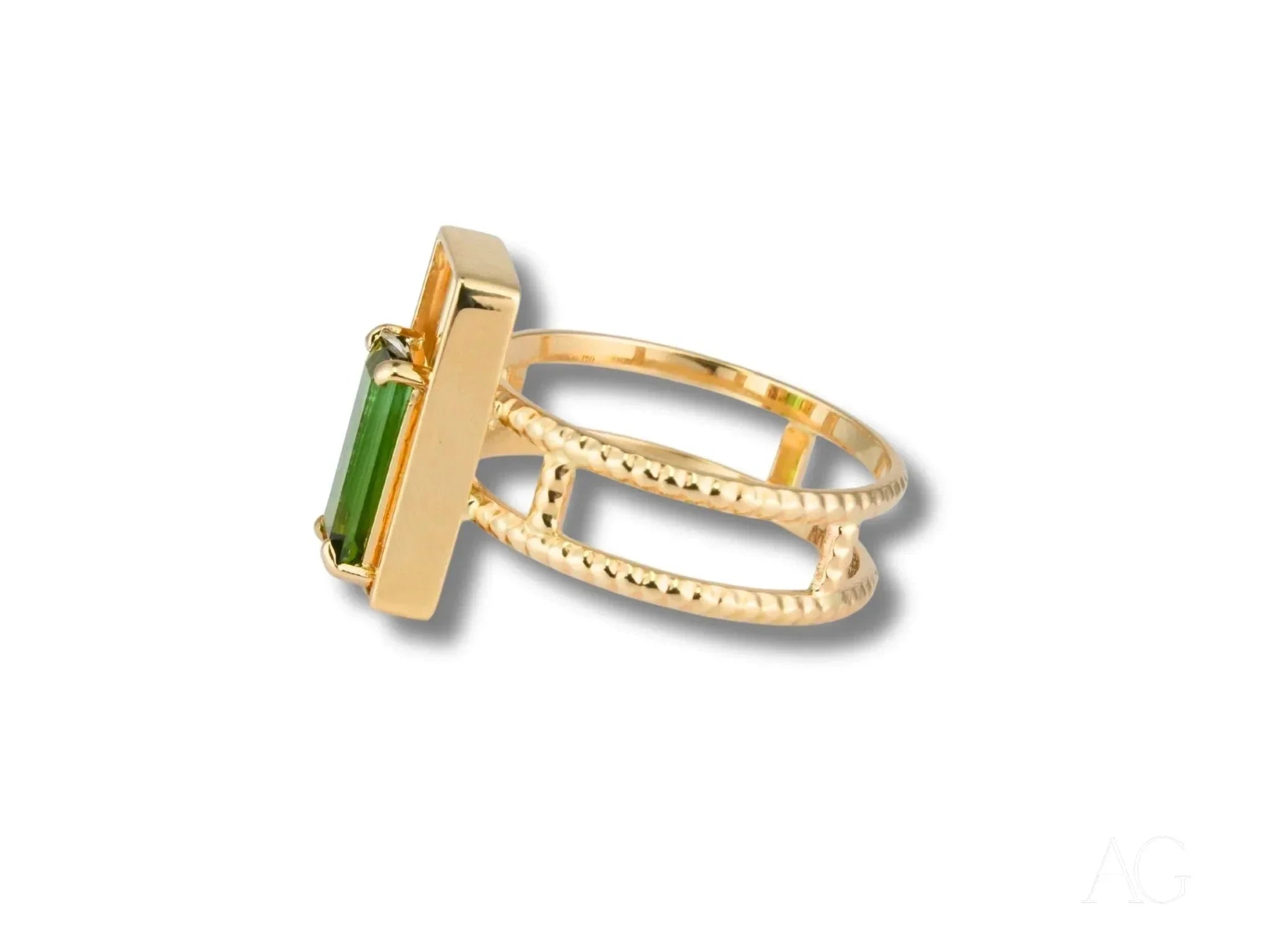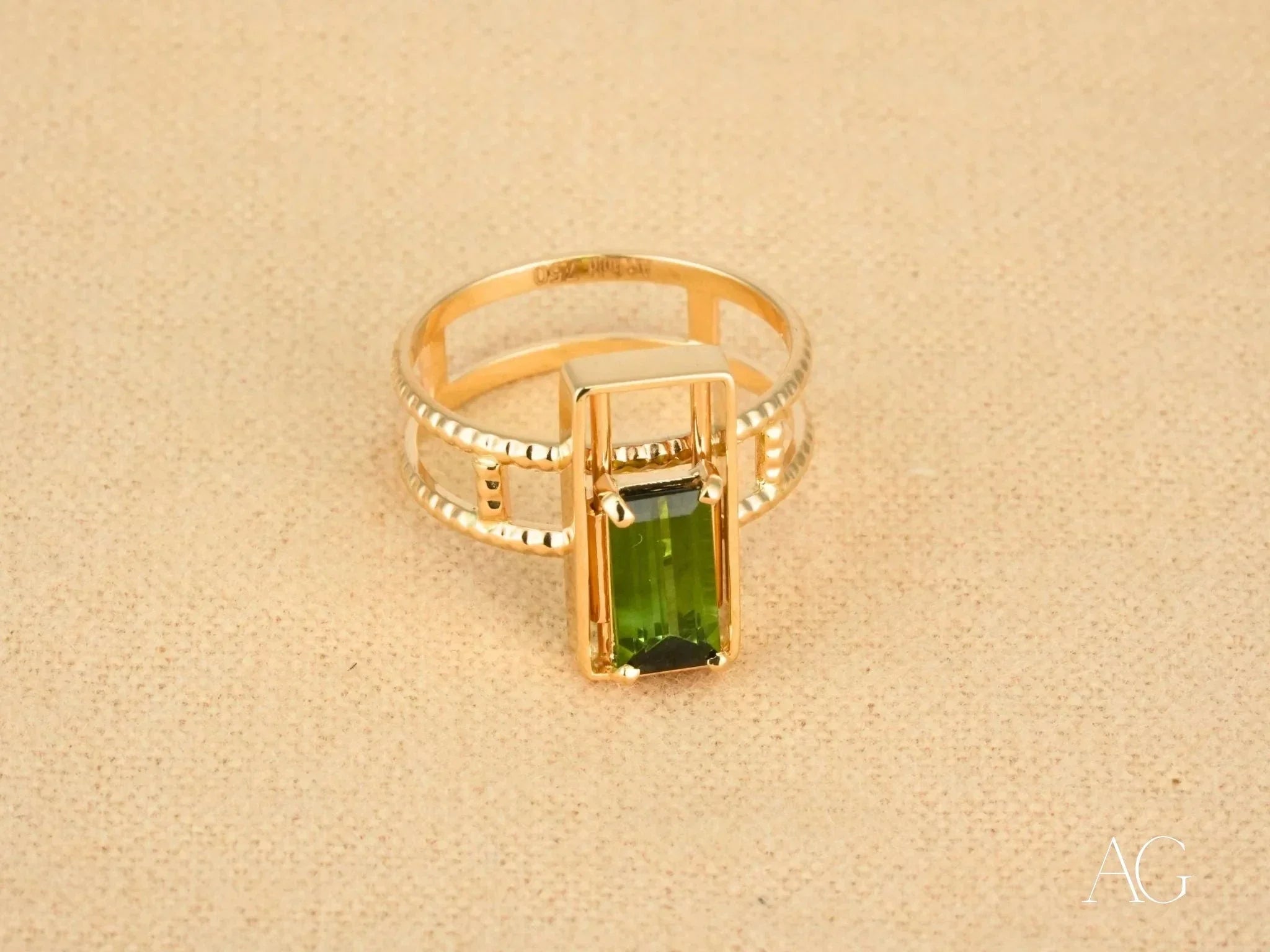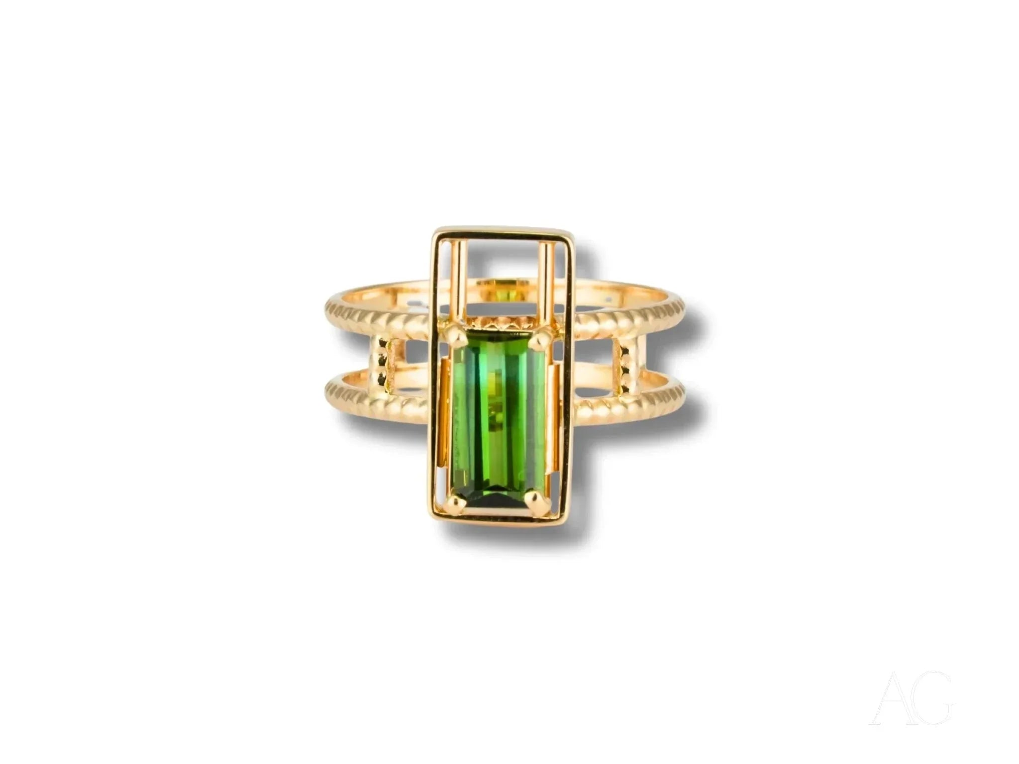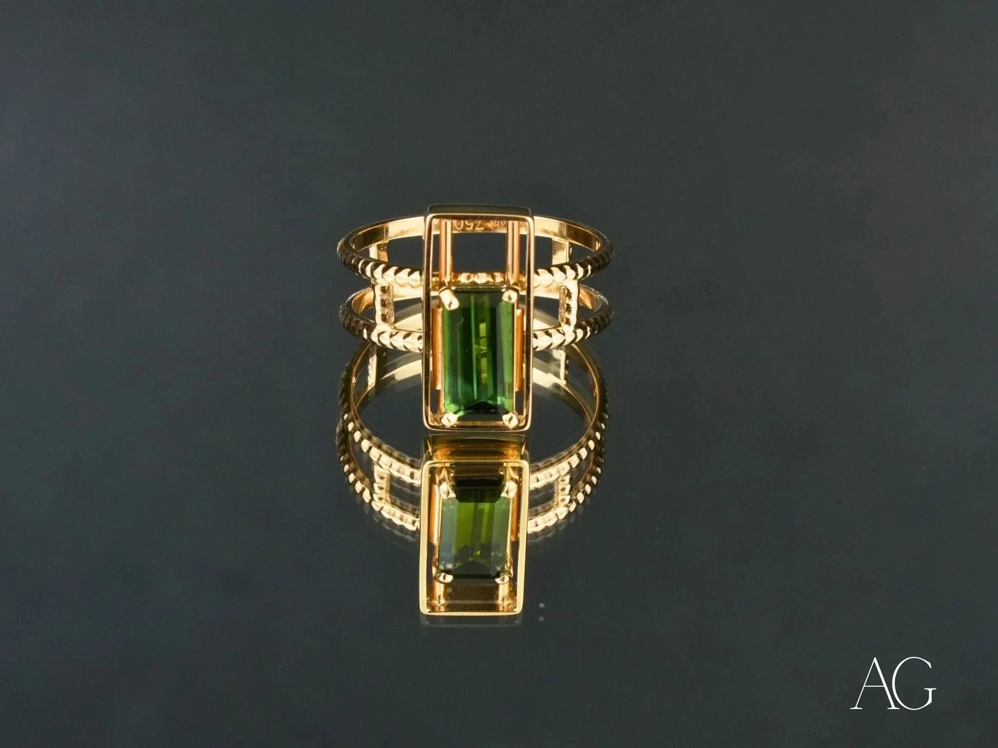 • Stunning Green Tourmaline: The heart of this ring is a vibrant baguette-cut green tourmaline, meticulously chosen for its exceptional color and clarity. Set within a sleek open-frame gold bezel, the gemstone’s natural beauty is amplified, radiating an enchanting glow.