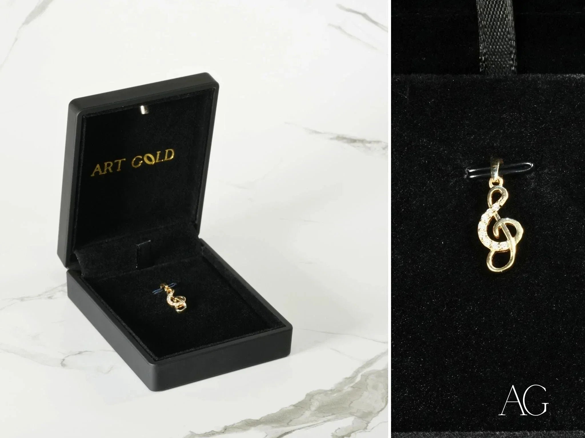 Premium 18k Gold Craftsmanship: Indulge in the rich, luminous glow of genuine 18k gold, expertly crafted for enduring beauty and a lifetime of wear.Iconic Treble Clef Design: More than just a musical symbol, the graceful treble clef embodies creativity, harmony, and the power of artistic expression. This treble clef pendant is a wearable celebration of your passion for music.Dazzling Cubic Zirconia Accents: Hand-selected cubic zirconia stones, renowned for their brilliance and fire, add a touch of glamour and enhance the pendant's inherent elegance. These dazzling accents catch the light with every movement, creating a mesmerizing sparkle.Lightweight & Comfortable: Designed for effortless everyday wear, the Harmonic Elegance pendant’s delicate 1.47-gram weight ensures comfortable elegance from morning to night.Versatile Styling: From casual coffee dates to dazzling concert nights and elegant galas, this art gold jewelry piece transitions seamlessly, adding a touch of sophisticated charm to any ensemble. It’s also the perfect gift for the musician or music lover in your life.