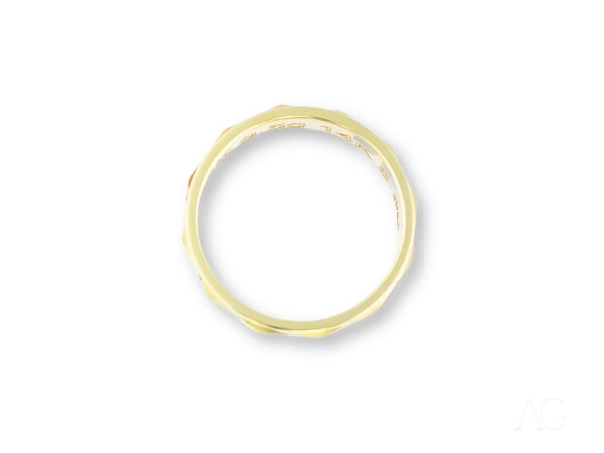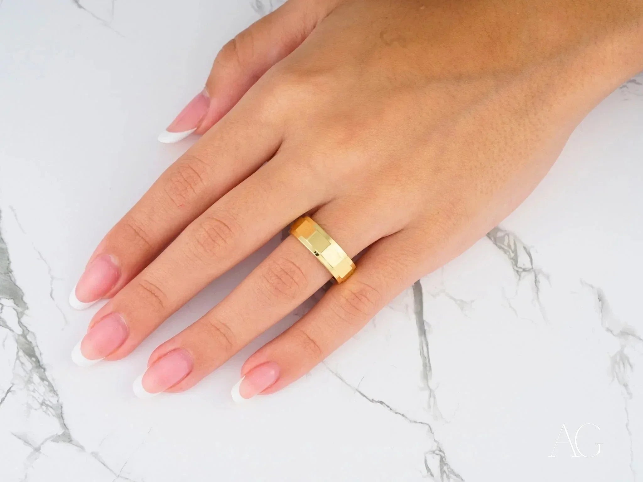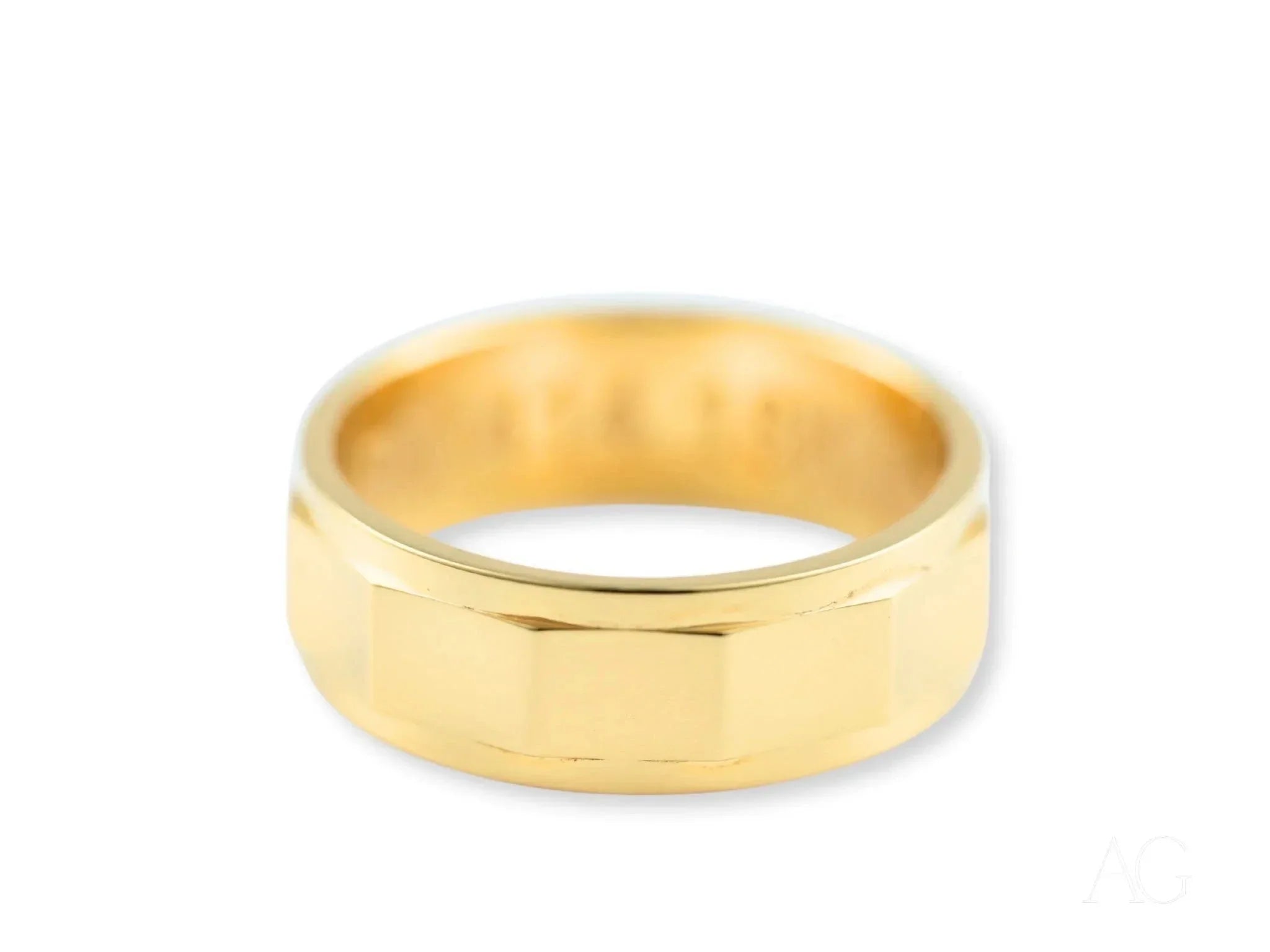 Geometric Facet Design: More than just a visual masterpiece, the intricate facets of the Imperial Facet create a mesmerizing play of light, adding depth and sophistication to this bold design. Each facet catches and reflects brilliance, symbolizing the multifaceted nature of your relationship.7mm Wide Band: The substantial 7mm width of this classic fit band exudes confidence and elegance. It’s a statement of enduring commitment, designed to be noticed and admired.Available in 18k or 14k Gold: Art Gold Jewelry offers the choice of radiant 18k gold, known for its rich, luxurious hue, or the enduring strength of 14k gold, perfect for those with an active lifestyle. Select the gold that best reflects your individual style and needs.Classic Fit: The Imperial Facet's classic fit band provides unparalleled comfort for everyday wear. It sits securely and comfortably on the finger, allowing you to move freely while enjoying its refined elegance.Durable Craftsmanship: Meticulously crafted by Art Gold Jewelry, this band is built to withstand the test of time, mirroring the unwavering strength of your bond. The Imperial Facet is more than just a ring; it's a legacy.