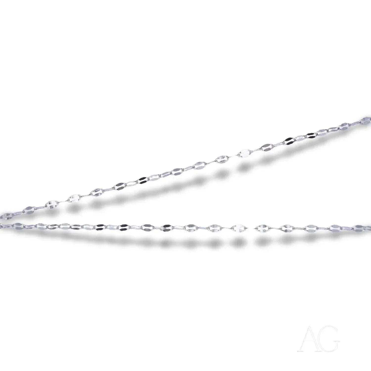 What is the thickness of the chain? Meticulously crafted to strike a balance between delicate allure and enduring strength, this chain offers both elegance and resilience for everyday wear. Its subtle presence adds a touch of sophistication without overpowering your style.Can this chain be adjusted? Its fixed 17.5-inch length is expertly designed to complement a wide range of necklines, ensuring a flawless drape every time. This thoughtful design eliminates the need for adjustments, providing a perfect fit straight out of the box.Is this chain suitable for sensitive skin? Absolutely! Crafted from hypoallergenic 18k white gold, this chain is gentle on even the most delicate skin. Enjoy its radiant beauty without worry, knowing it’s designed for lasting comfort.