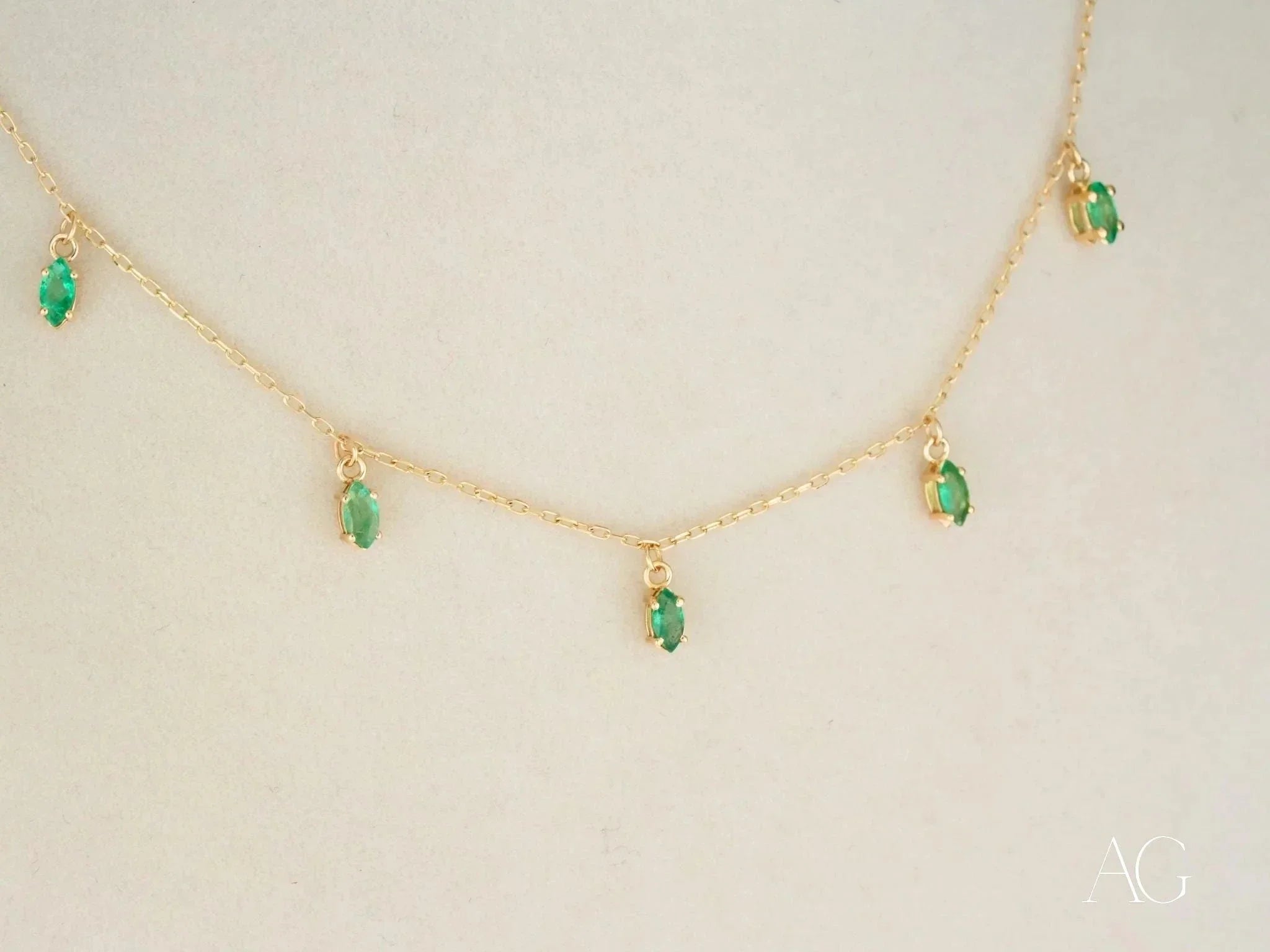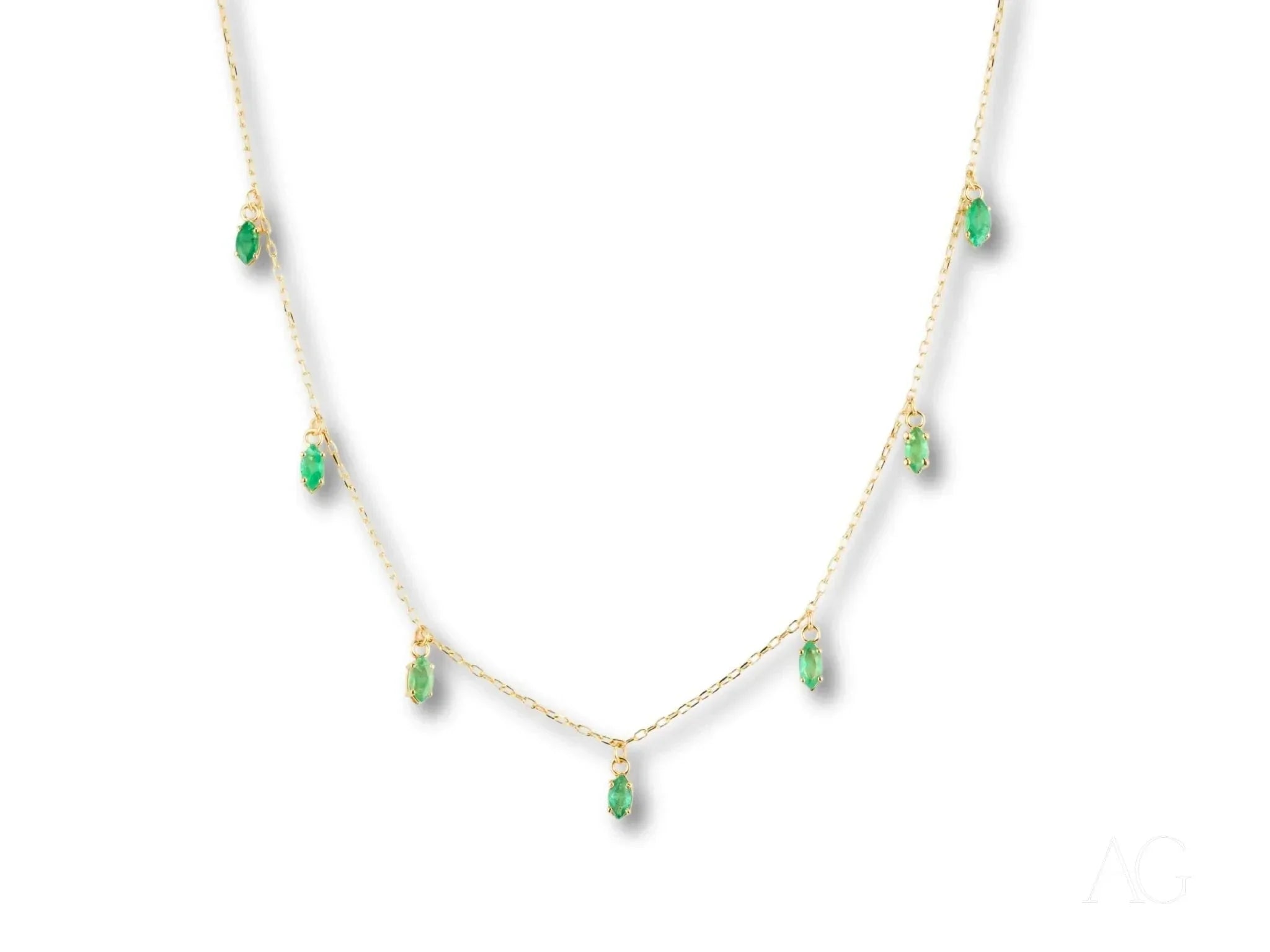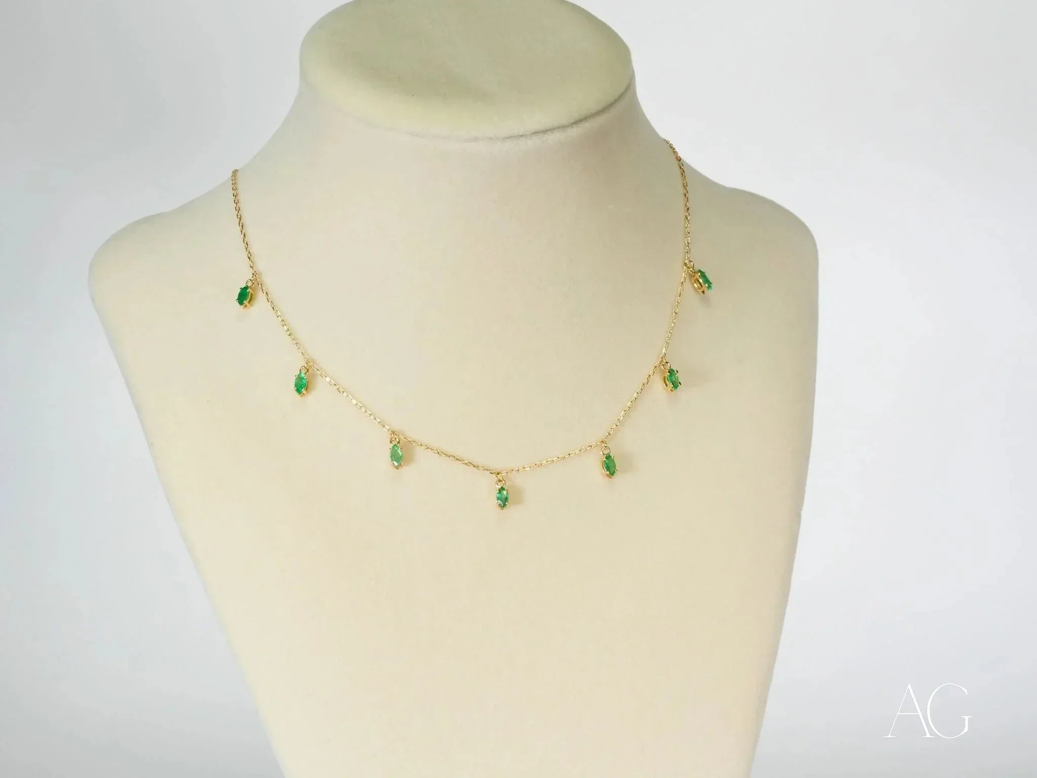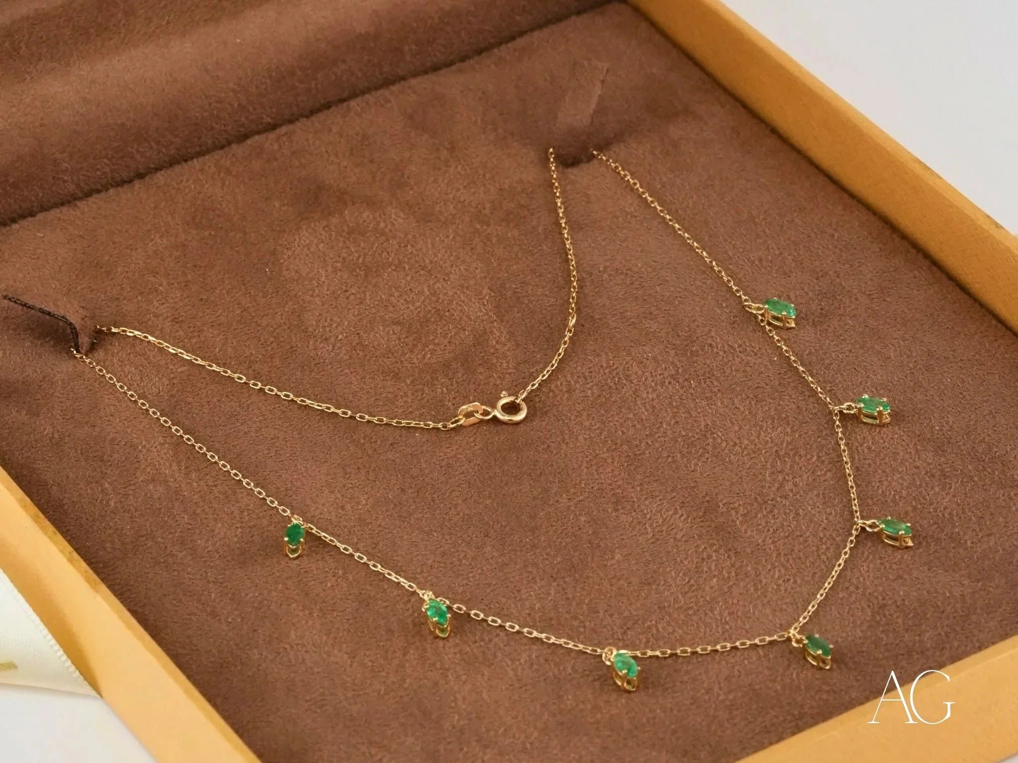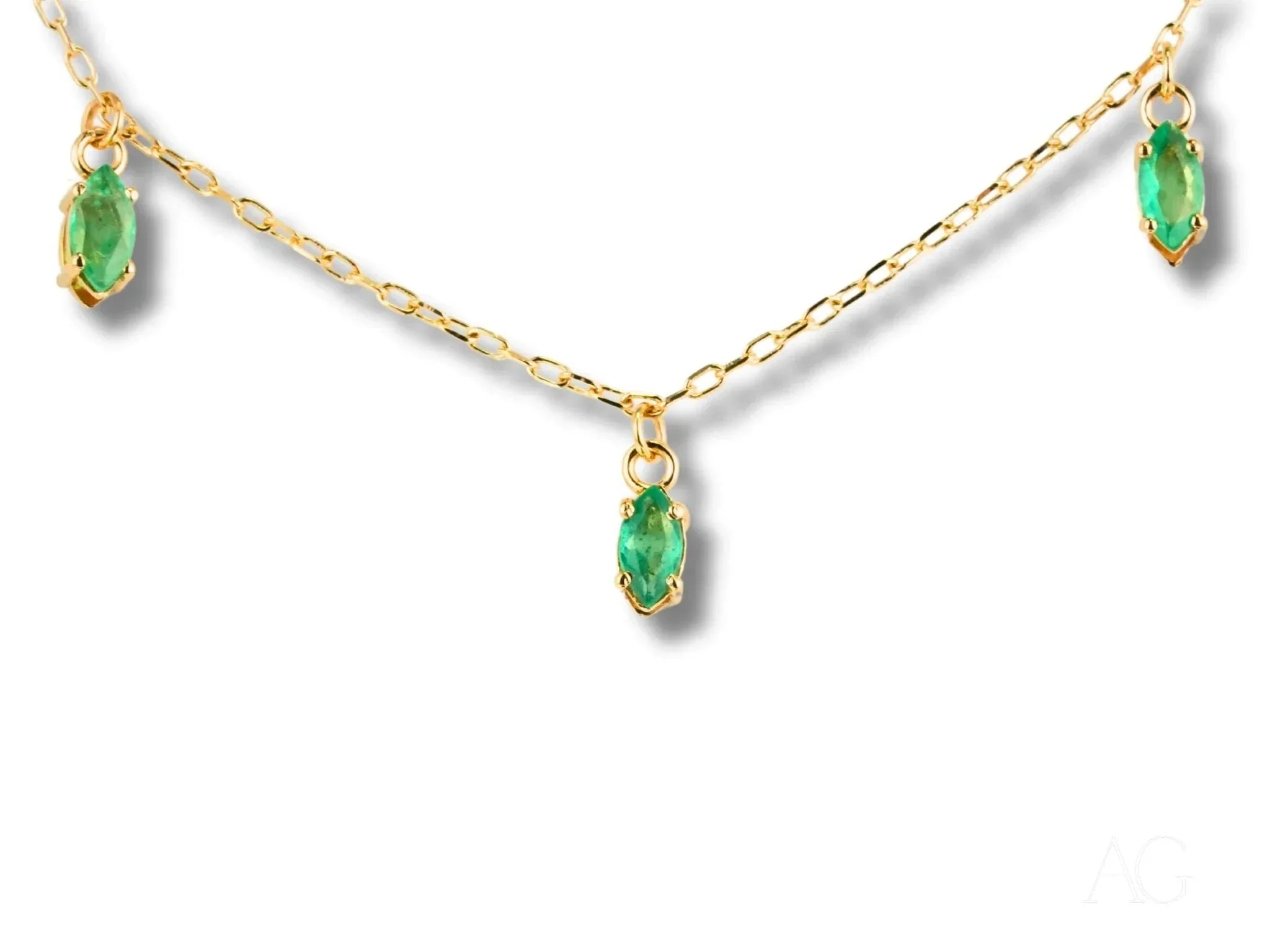 • Chain Style: Fine 18k gold chain with emerald dangle accents