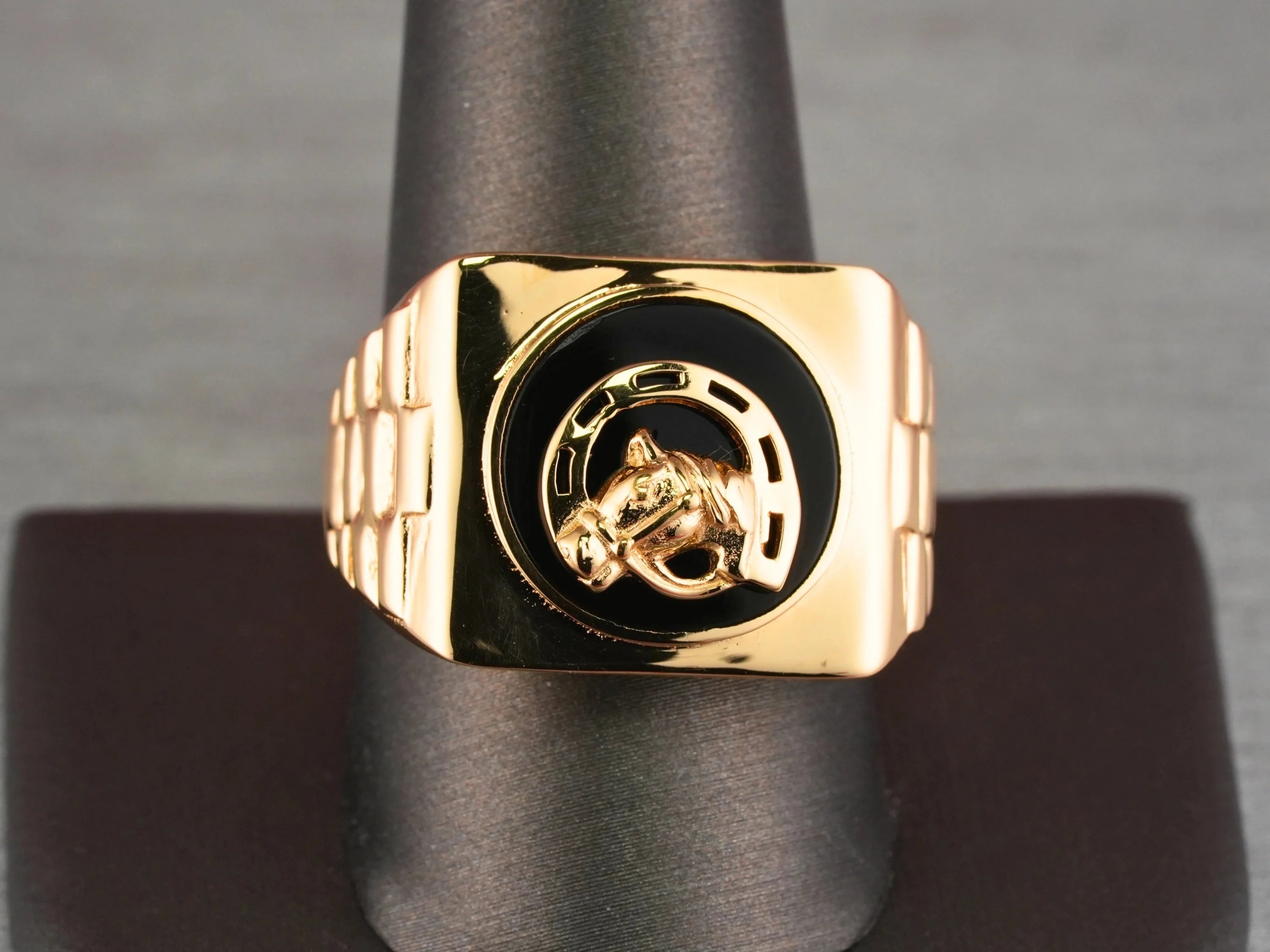 Gold ring with black onix horse shoes face featuring horse shoe motif and horse head design