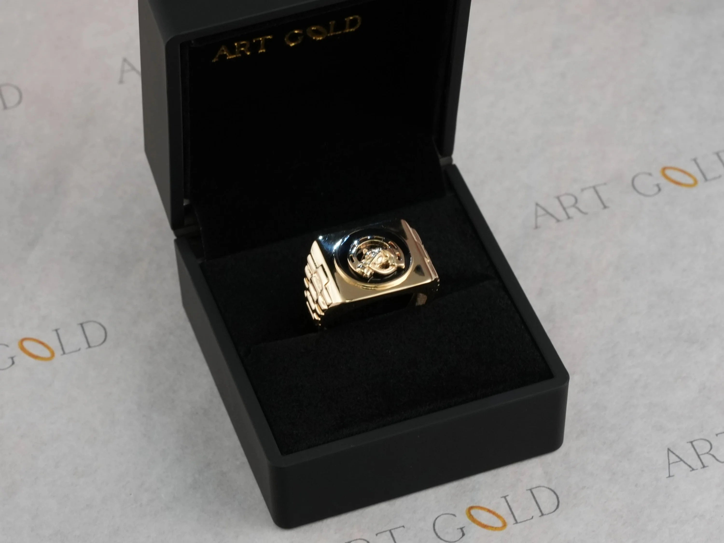 Shiny gold 18kg Onix Horse Shoes ring with horse shoe motif and black gold bull’s head design