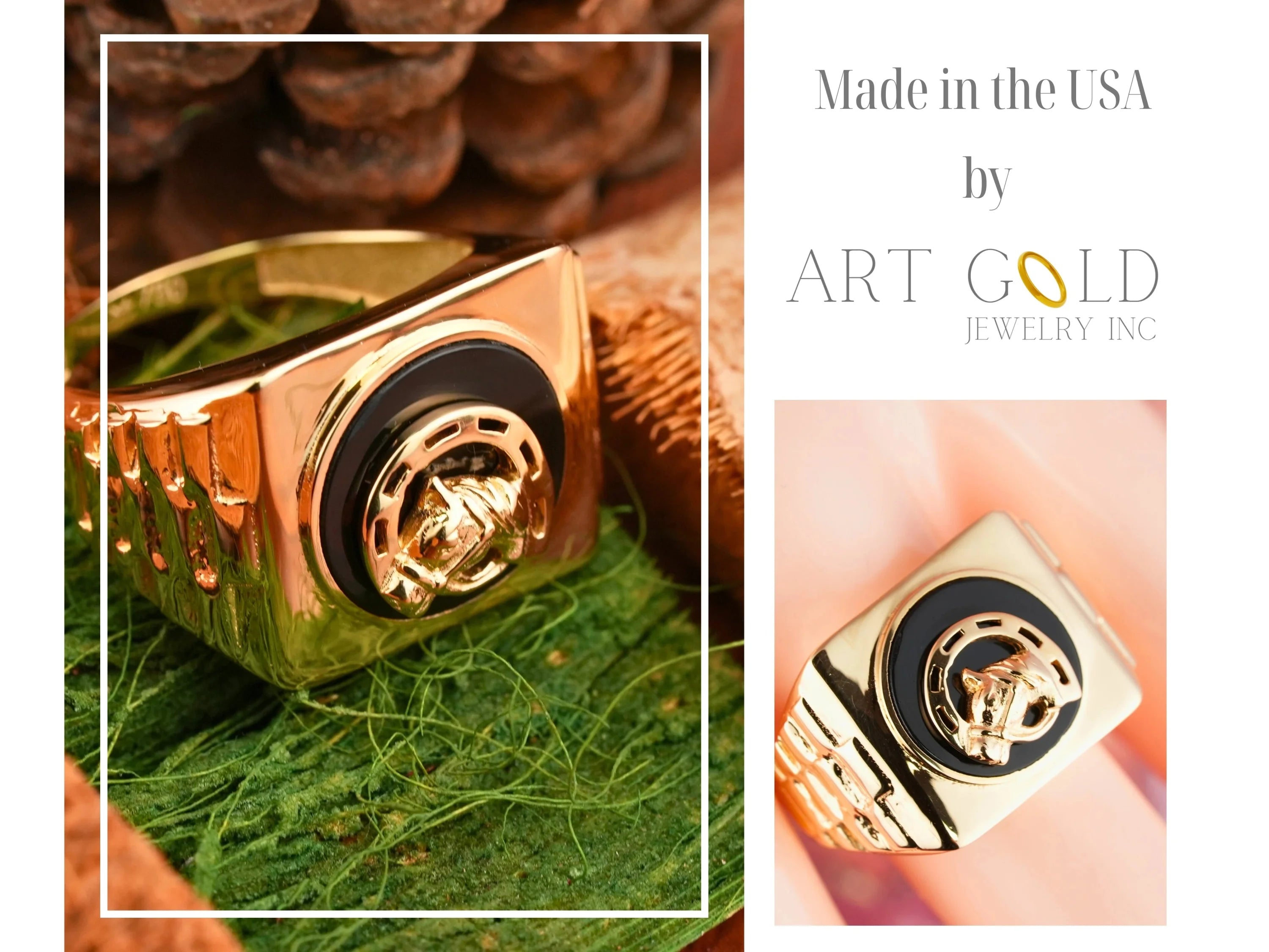 Gold signet ring with onix horse shoes and horse shoe motif featuring a black onyx inlay