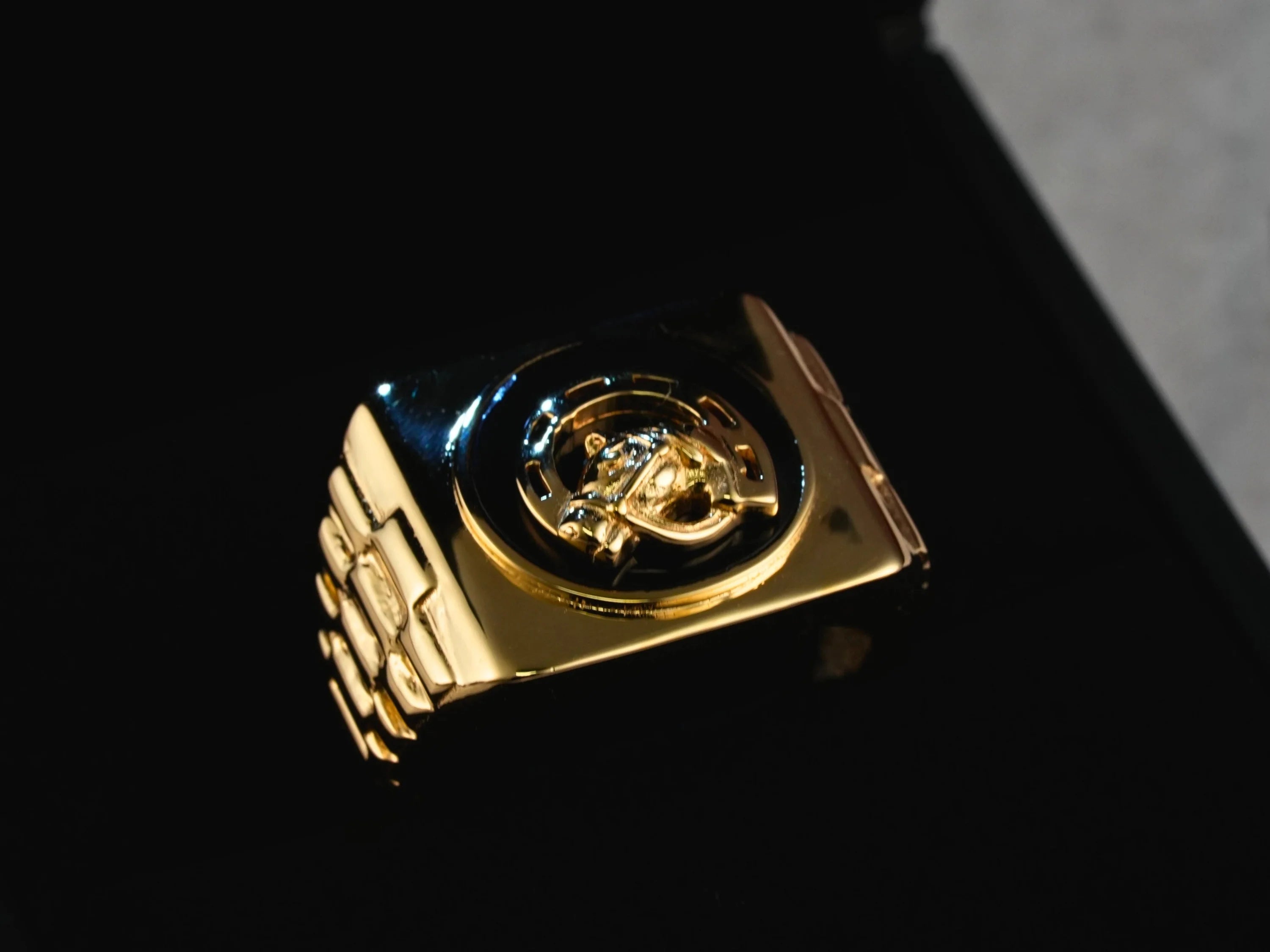 Gold signet ring with black enamel face featuring a raised gold jaguar head, onix horse shoes motif