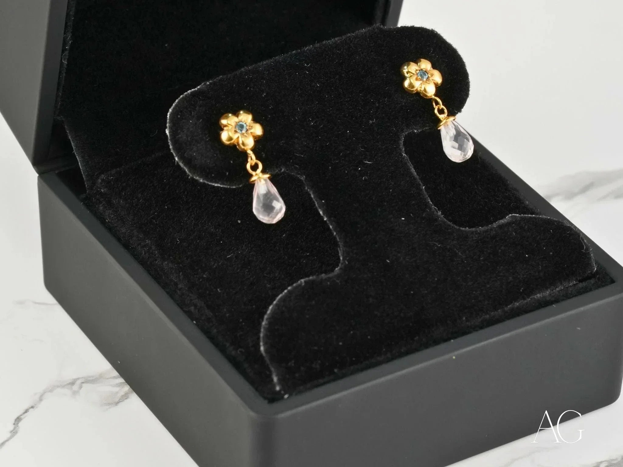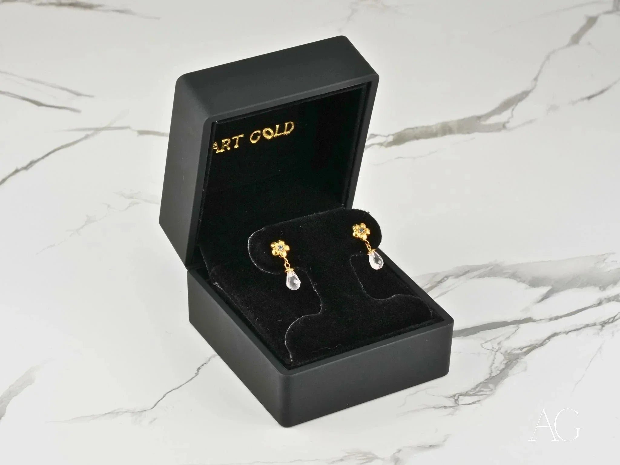 Indulge in breathtaking romantic elegance and delicate beauty with the Petal Drops Flower Earrings, exquisitely handcrafted from solid 18K gold. These enchanting crystal drop earrings showcase golden flower studs, each adorned with dazzling CZ stones, and faceted teardrop crystals that dangle with captivating grace, symbolizing grace, femininity, and timeless charm. The harmonious blend of floral elegance and shimmering crystals creates an aura of refined luxury and poetic allure, elevating your style for romantic evenings, special occasions, or adding a touch of magic to your everyday look.