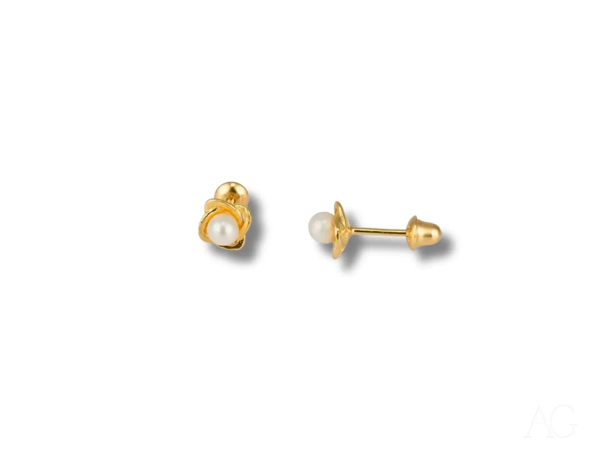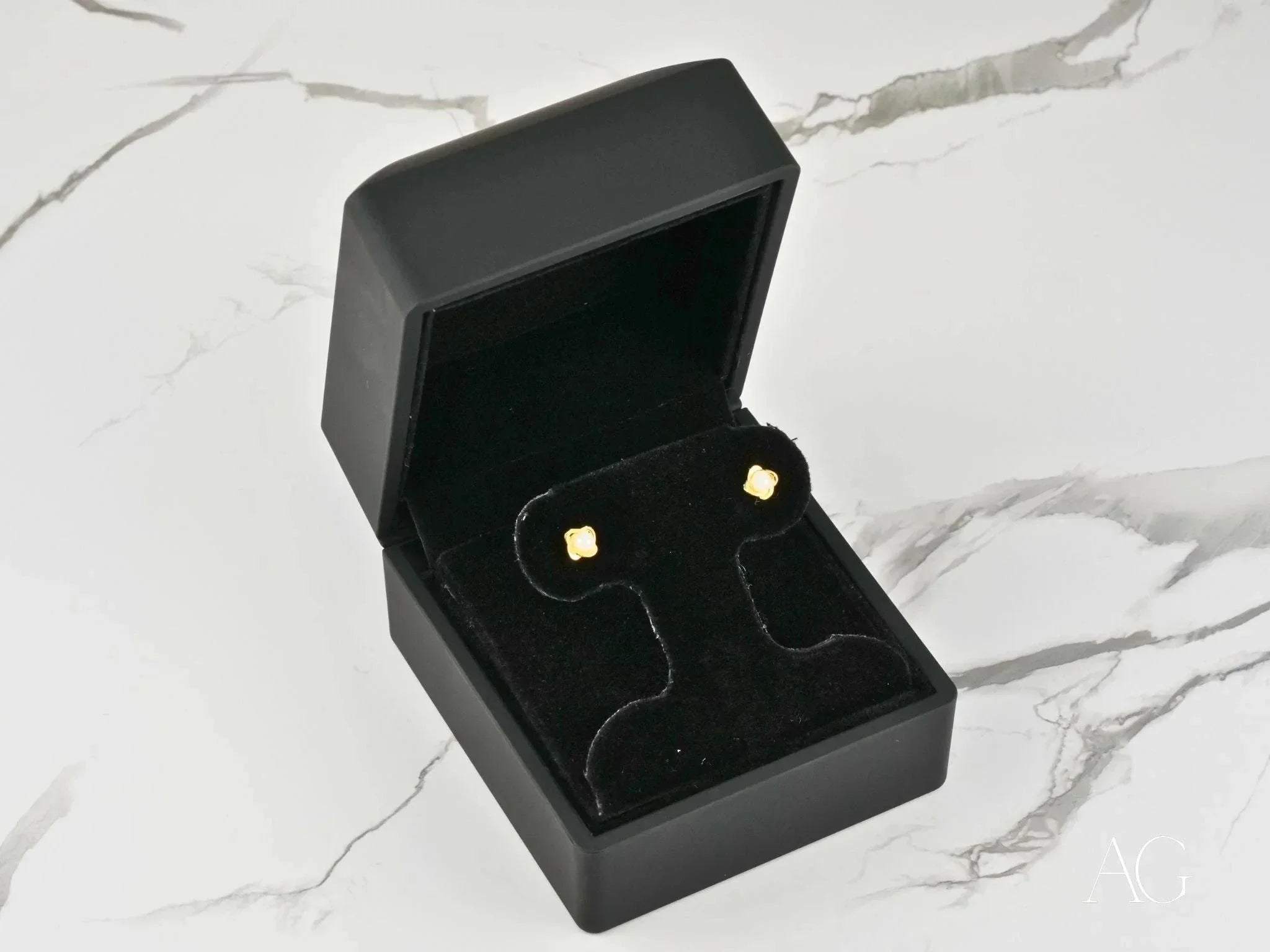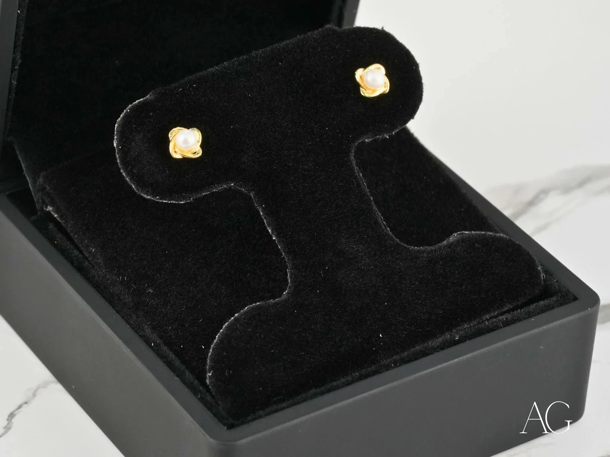 Indulge in exquisite elegance with the Petite Blossom Pearl Earrings, meticulously handcrafted in solid 18K gold. Featuring luminous 2.8mm pearls nestled within a captivating floral-inspired gold setting, these 18k gold pearl earrings flawlessly blend natural beauty with timeless sophistication. Perfect for elevating your everyday style or adding a touch of magic to special occasions, the Petite Blossom earrings are a radiant symbol of grace and refined luxury, making them a treasured addition to any jewelry collection. These gold pearl earrings are a testament to Art Gold design.