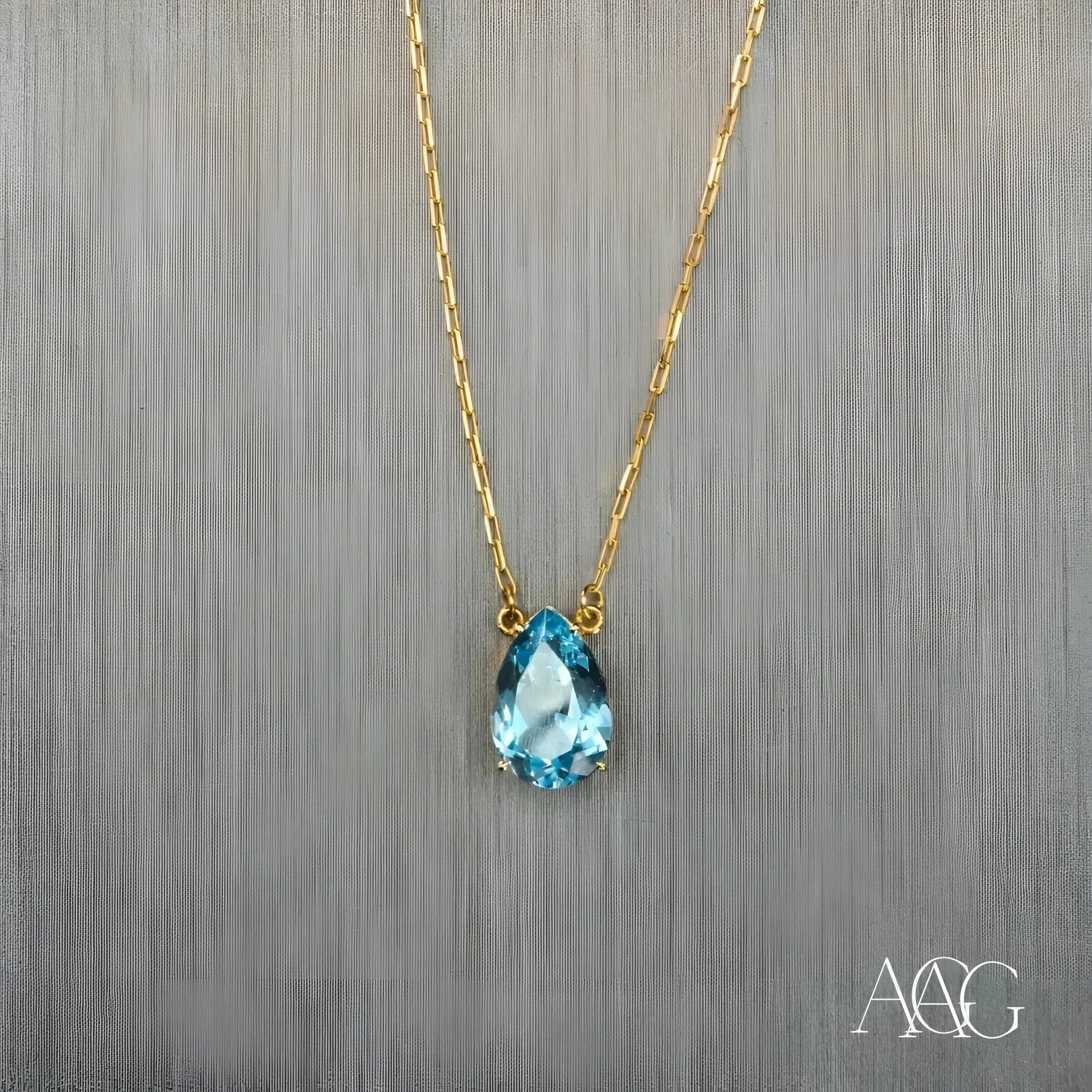 The Serene Beauty of Blue Topaz in 18 Carat Gold Our 18 Carat Gold Necklace showcases a stunning centerpiece: a vibrant Blue Topaz gemstone, renowned for its clear, azure brilliance and captivating depth of color. The gem, expertly cut to maximize its light-catching properties, radiates a tranquil light against the opulent backdrop of 18 carat gold. This design, meticulously crafted for enduring beauty, offers a sophisticated touch that effortlessly elevates any ensemble, from everyday elegance to special occasion glamour. The secure clasp and carefully considered chain length ensure both comfort and a flattering drape.