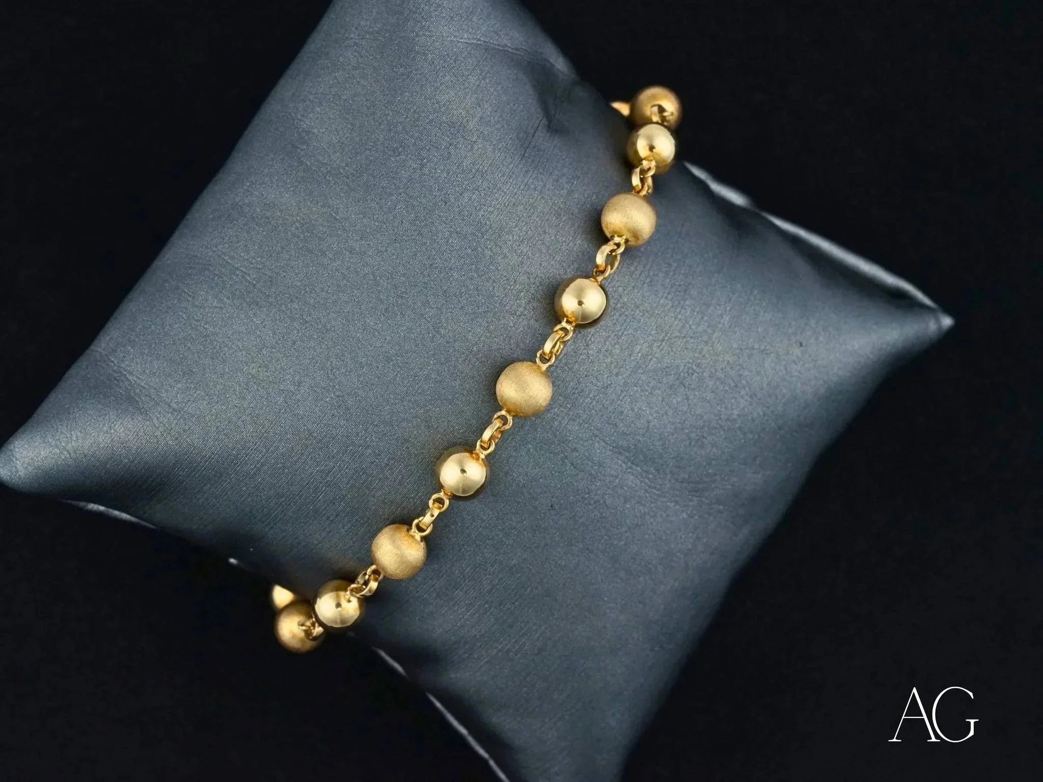 • Luminous Gold Spheres: The bracelet's captivating design centers around a sequence of small, exquisitely crafted gold spheres. The interplay of polished and matte finishes creates a dynamic visual texture, capturing and reflecting light with every movement, transforming this art gold jewelry into a wearable work of art.
