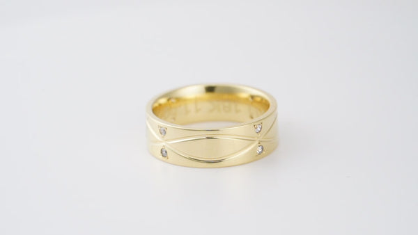 8 Half-Point Diamonds: Eight exquisitely cut half-point diamonds, totaling 0.4 carats, add a touch of brilliance and understated luxury. These ethically sourced diamonds are hand-selected for their exceptional clarity and fire, ensuring a radiant sparkle that lasts a lifetime.6.9mm Wide Band: The substantial 6.9mm width commands attention without overwhelming the hand, offering a bold yet refined statement of enduring commitment. This harmony wedding band is designed to be a symbol of your unwavering bond.Comfort Fit Design: Experience the unparalleled comfort of the smooth inner curve. This thoughtful design element ensures a snug, comfortable fit, allowing you to wear your Radiant Harmony wedding band with ease, all day, every day. Durable Gold Craftsmanship: Meticulously crafted from your choice of luxurious 18k or 14k gold by Art Gold Jewelry, this band is built to withstand the test of time. The durable gold construction ensures that your symbol of love remains as radiant as the day you said "I do."Unisex Appeal: The Radiant Harmony's timeless design transcends gender norms, making it a versatile and elegant choice for couples seeking matching wedding rings. Its sophisticated aesthetic complements any style, symbolizing the unity and shared journey of two souls.