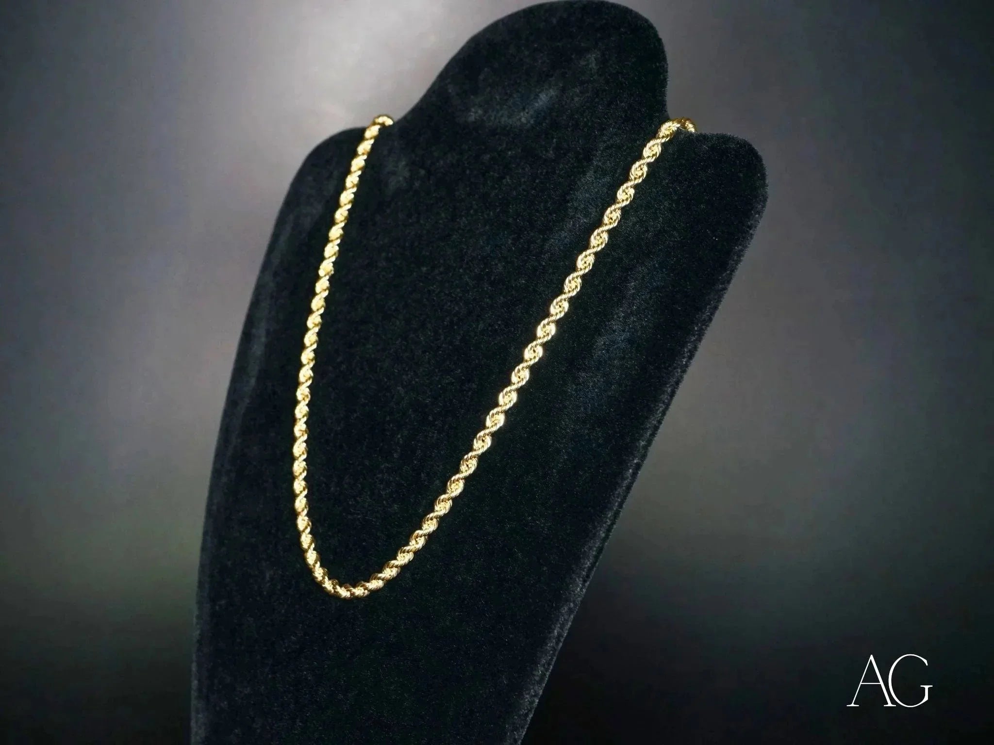 Timeless Sophistication: Behold the radiant allure of this Solid 14k Gold Rope Chain Necklace! A masterpiece of art gold, it embodies timeless elegance and enduring style. The 14-gram weight (approximately 0.49 ounces) of this 16-inch (40.6 cm) necklace drapes luxuriously, striking the perfect balance between opulence and everyday wearability. The classic rope chain design, meticulously crafted from solid 14k gold, adds a touch of vintage charm, while the robust lobster lock ensures secure, worry-free wear, making it an exceptionally versatile accessory for any occasion.