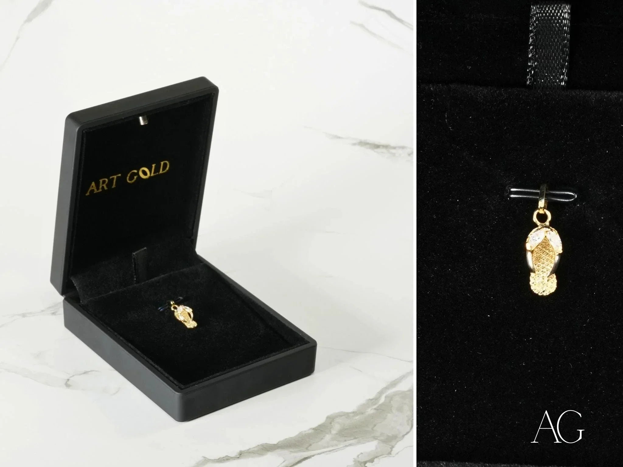 Premium 18k Gold Craftsmanship: Indulge in the luxurious feel of solid 18k gold, ensuring lasting shine and a timeless elegance that will elevate any outfit. This art gold piece is crafted with meticulous attention to detail, making it a treasured addition to your jewelry collection.Cubic Zirconia Accents: Hand-set cubic zirconia stones add a breathtaking sparkle, catching the light with every movement and enhancing the pendant’s playful charm. These dazzling accents create a luxurious look without the luxury price tag.Flip Flop Design: More than just a pendant, the sparkling flip flop is a symbol of relaxation, vacation bliss, and cherished summer memories. Let it transport you to your happy place with every glance.Lightweight Elegance: At just 0.9 grams, this delicate pendant offers subtle everyday elegance without ever feeling heavy or cumbersome. Enjoy effortless style from sunrise to sunset.Versatile Styling: Perfect for beachwear, summer outfits, or even as a fun, eye-catching charm layered with other pendants. This sparkling flip flop pendant effortlessly transitions from day to night, adding a touch of playful sophistication to any look.