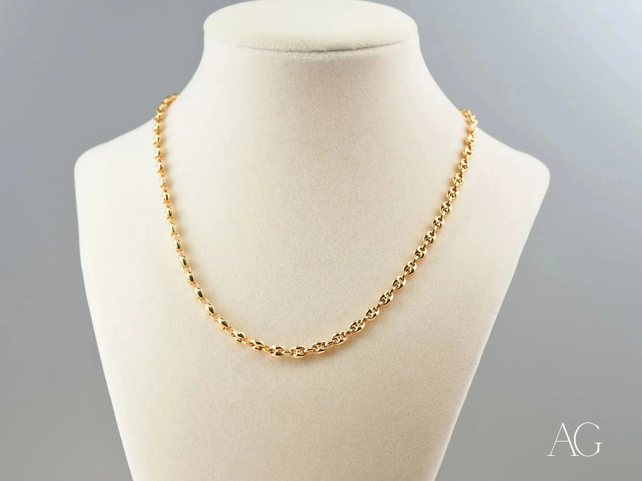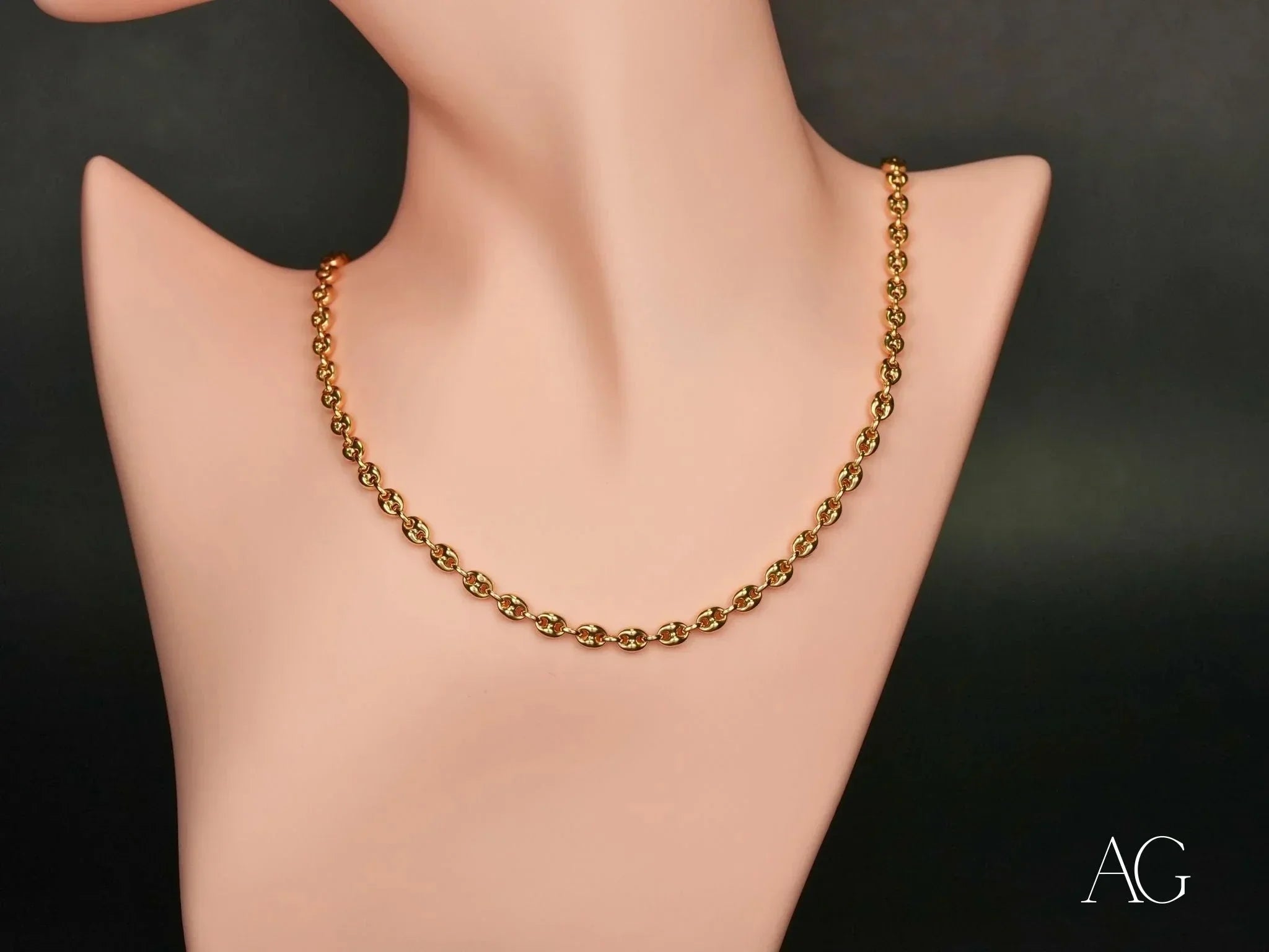 Command attention with this bold and beautiful 18K gold necklace. Exuding confidence and undeniable style, this substantial 9mm wide, 18k solid gold masterpiece drapes luxuriously against your skin. Secured with a robust lobster clasp, it’s the ultimate statement of strength, sophistication, and timeless elegance. This bold 9mm 18k necklace is more than just jewelry; it's an investment in your personal style and a symbol of enduring luxury.