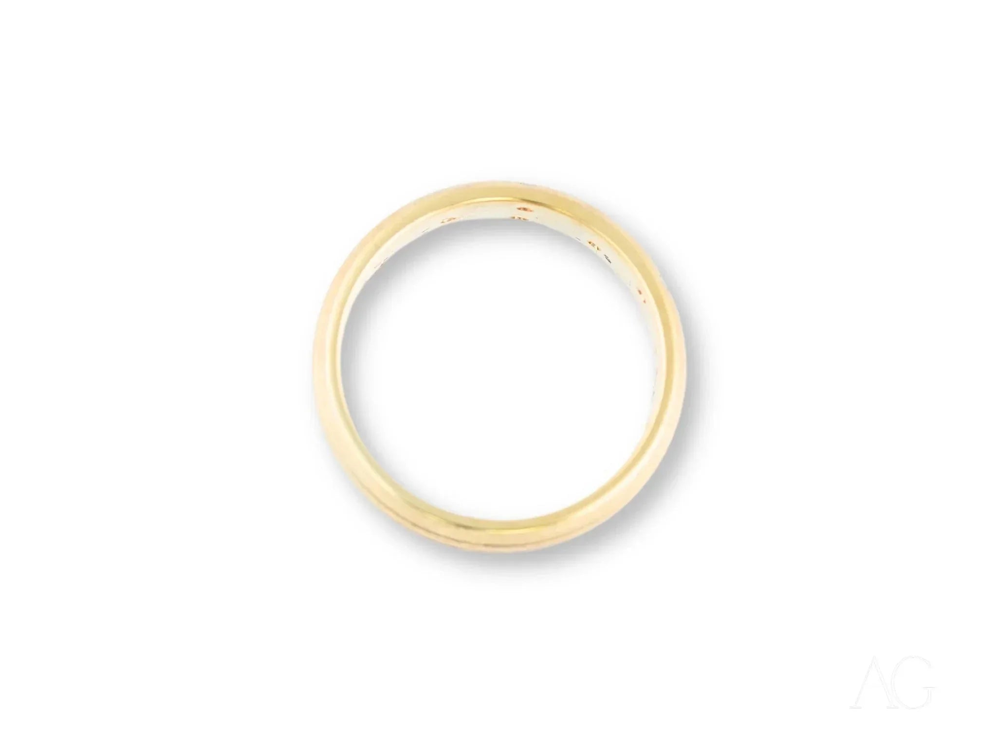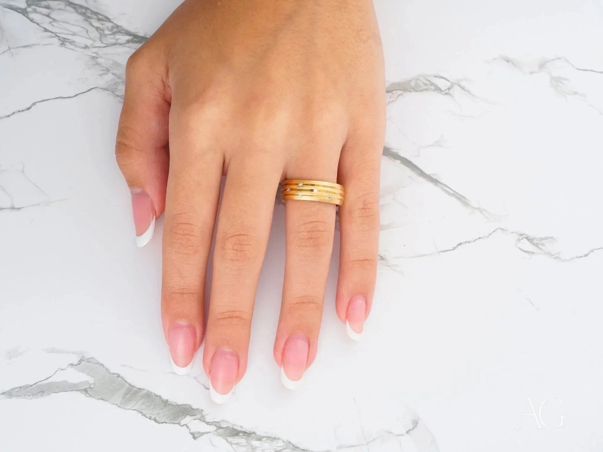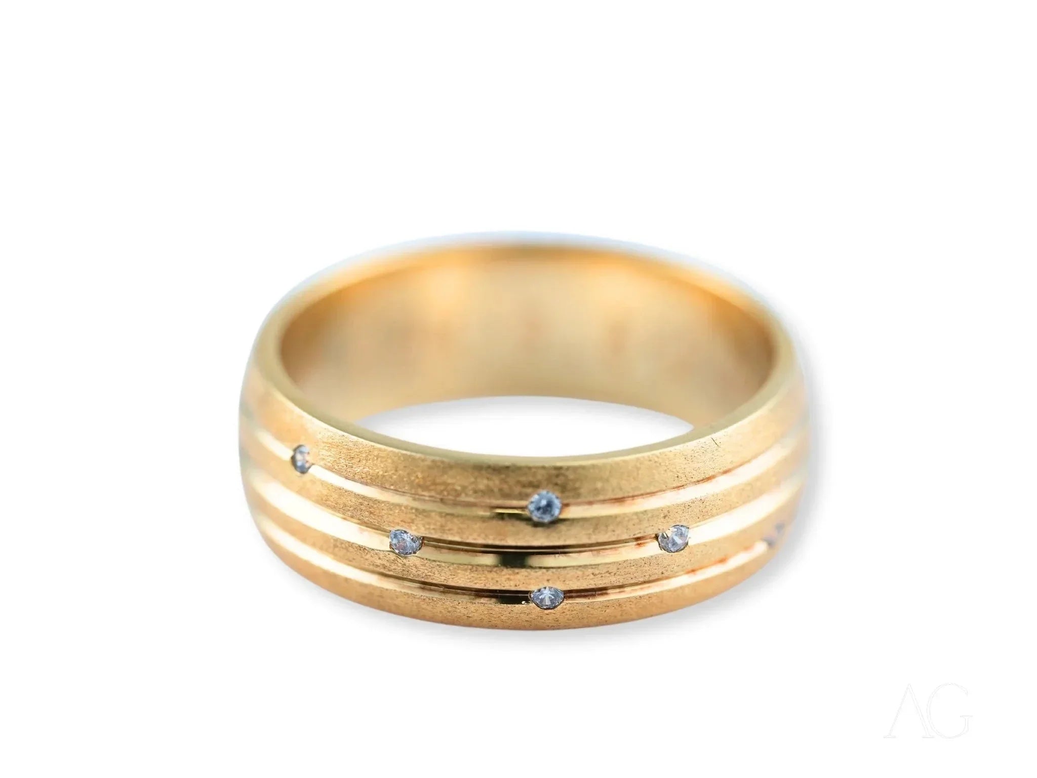 Sleek Gold Lines with Diamond Accents: The parallel sleek gold lines, a signature of the Stellar Strands design, are elegantly accented with ethically sourced diamonds. These shimmering stones, reminiscent of a celestial constellation, symbolize the guiding light of love, adding both brilliance and profound meaning to this exquisite piece.7.1mm Wide Band: The 7.1mm width provides a bold yet refined statement, making this band a striking symbol of your commitment. This substantial width beautifully showcases the sleek gold lines and diamond accents, creating a captivating interplay of light and texture.Available in 18k or 14k Gold: Choose the luxurious richness and warm glow of 18k gold, or the enhanced durability and subtle radiance of 14k gold from Art Gold Jewelry. This allows you to select the perfect metal to reflect your personal style and lifestyle.Classic Fit: Designed for unparalleled everyday comfort, the classic fit of the Stellar Strands ensures the ring sits perfectly and securely on your finger, allowing for effortless wear and enduring enjoyment.Timeless and Modern Design: The harmonious blend of sleek gold lines and dazzling diamond accents makes this wedding band from Art Gold a timeless treasure and a modern masterpiece, a perfect embodiment of enduring love and contemporary style.