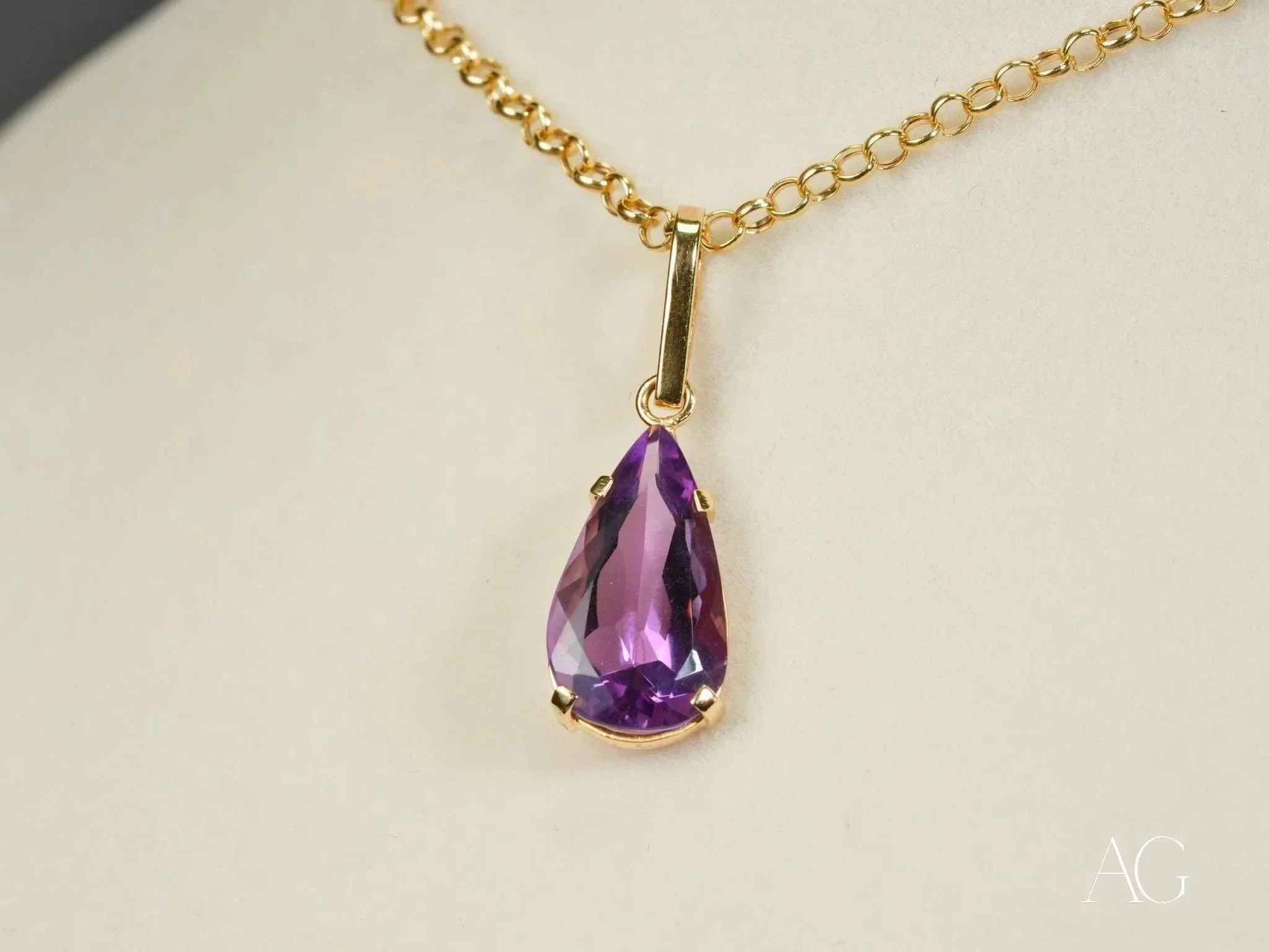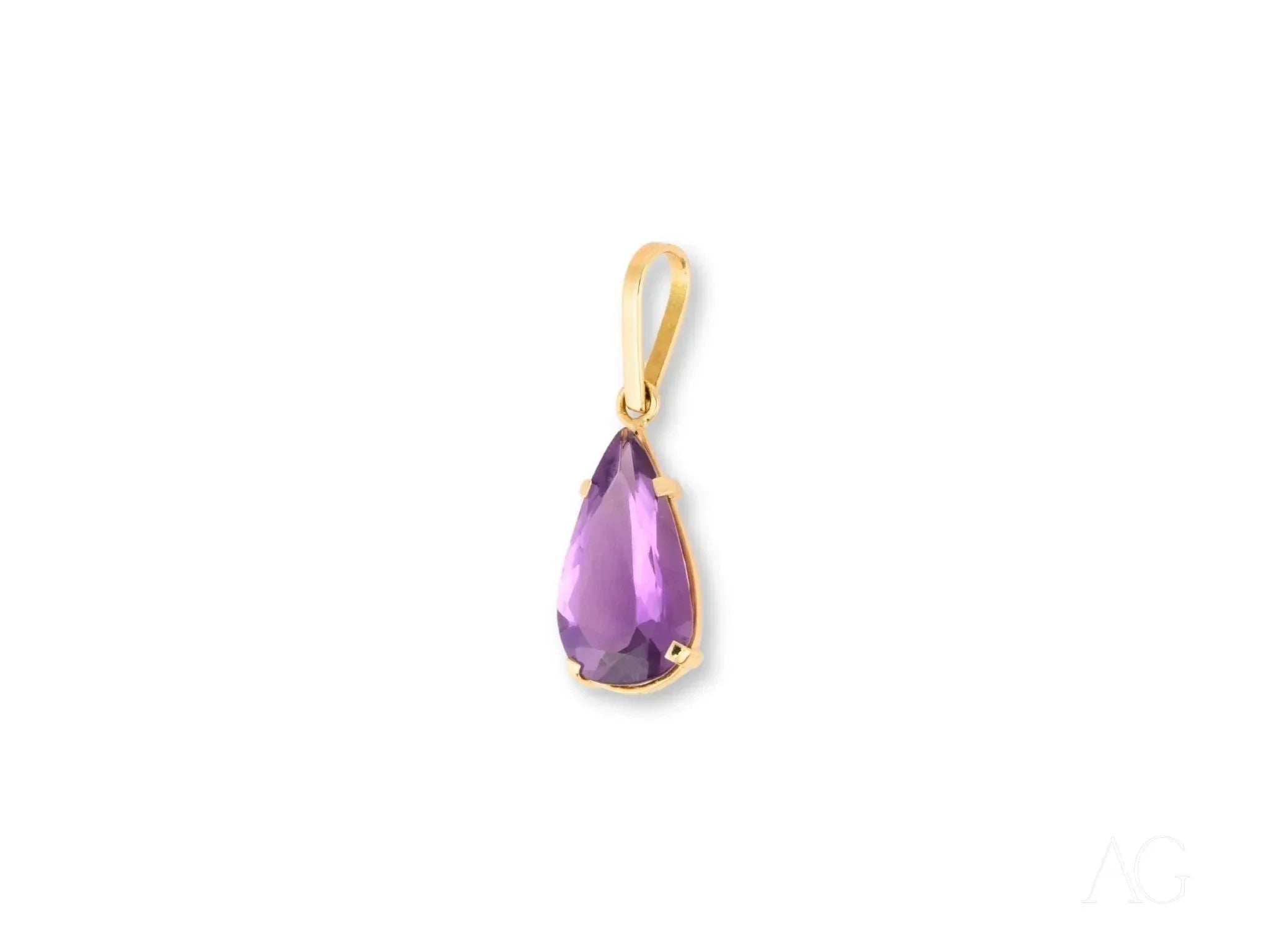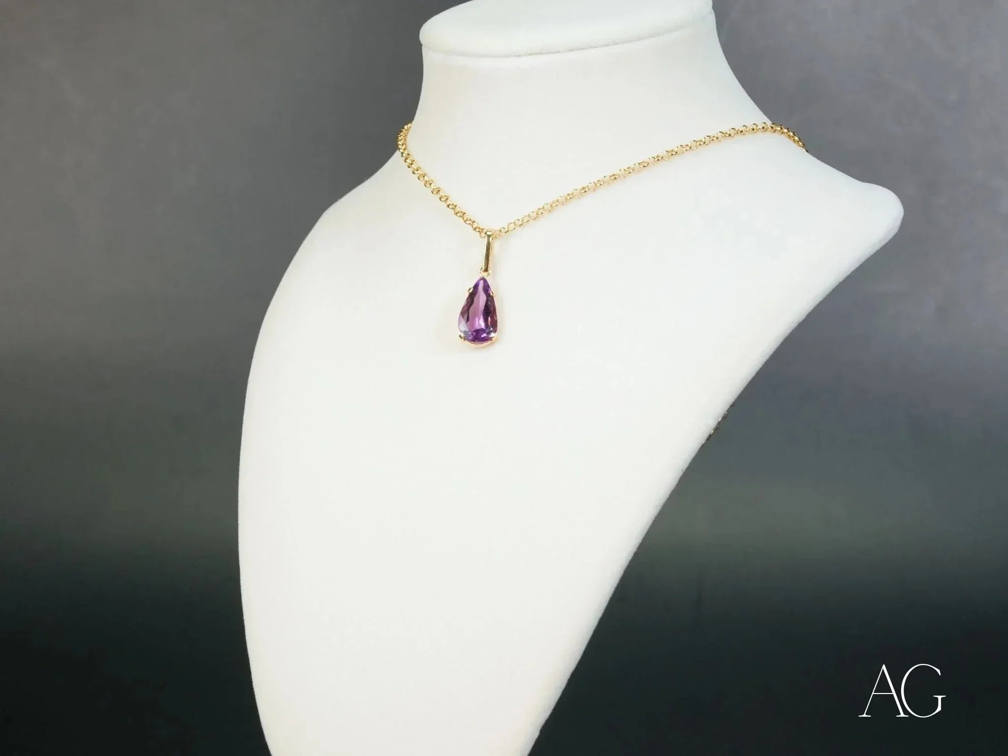 Premium 18k Gold Craftsmanship: Crafted from the finest high-quality 18k solid gold, this pendant boasts a luminous, enduring finish that resists tarnishing, ensuring its beauty lasts a lifetime. Genuine Amethyst Gemstone: The deep, rich violet hue of the natural amethyst gemstone evokes feelings of sophistication, tranquility, and inner peace. Its captivating brilliance adds a touch of mystique to your style.Lightweight Design: At a featherlight 2.0 grams, the Violet Bloom pendant drapes comfortably against your skin, allowing for effortless all-day wear while maintaining a luxurious presence.Minimalist Elegance: The simple yet captivating design transcends fleeting trends, making it a versatile accessory suitable for casual wear, formal events, or even as a symbol of your spiritual journey. The Violet Bloom Pendant effortlessly elevates any ensemble.Symbolic Meaning: Amethyst is revered for its association with balance, calmness, and spiritual growth, imbuing this pendant with profound meaning and making it a truly special piece to cherish.
